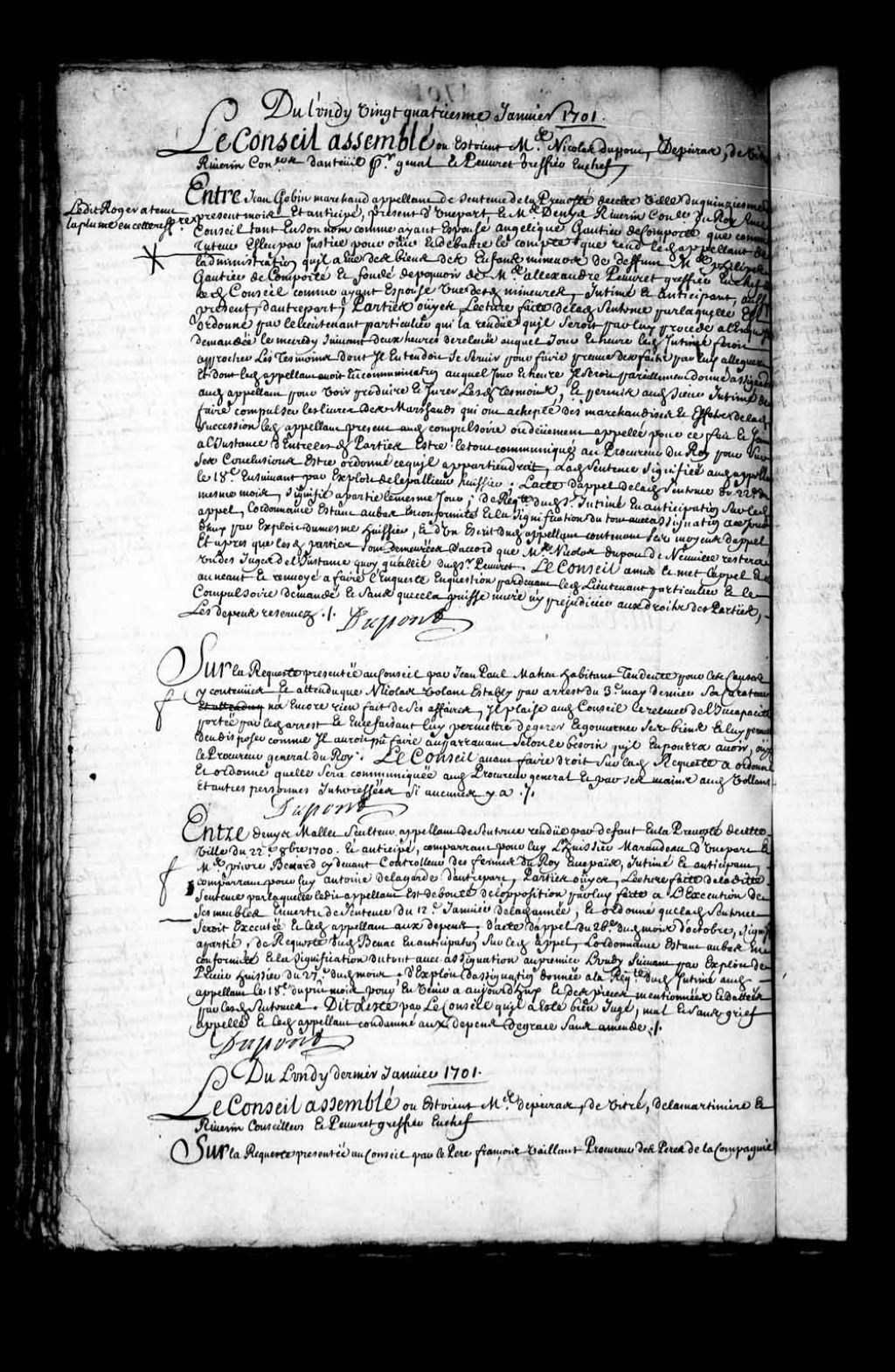Ordre du Conseil de communiquer la requête de Jean-Paul Maheu au procureur général au sujet de son tuteur, Nicolas Volant, établi par l'arrêt du 3 mai 1700, 24 janvier 1701, Archives nationales à Québec, Fonds Conseil souverain, (03Q,TP1,S28,P6576).