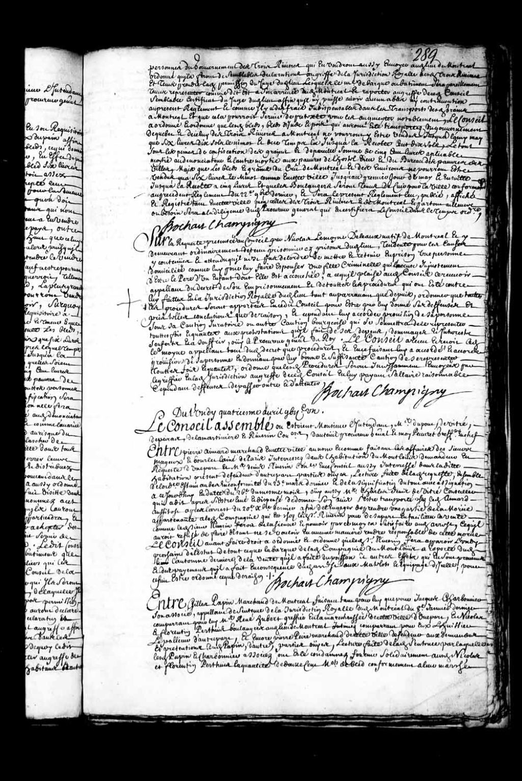 - Transcription du texte avec orthographe modernisée : «Sur la requête présentée au Conseil par Nicolas Lemoyne (Lemoine) Deleaux natif de Montréal et y demeurant ordinairement détenu prisonnier des prisons dudit lieu, tendante pour les causes y contenues et attendu qu'il n'est pas de l'ordre de mettre et retenir en prison une personne domiciliée comme lui pour lui faire épouser une fille criminelle qui l'accuse injustement d'être le père d'un enfant dont elle est accouchée, à ce qu'il plaise audit Conseil le recevoir appelant du décret de son emprisonnement et de toutes les procédures qui ont été contre lui faites en la juridiction royale dudit lieu tant auparavant que depuis, ordonner que toutes les procédures seront apportées en ce dit Conseil pour être par lui donné ses défenses et pris telles conclusions que de raison, et cependant lui accorder provision de sa personne sous sa caution juratoire ou autre caution bourgeoise qui se soumettra de le représenter toutes fois et quantes aux protestations qu'il fait de ses dépens, dommages et intérêts soufferts et à souffrir, ouï le procureur général du Roi. Le Conseil a reçu et reçoit ledit Lemoyne appelant tant dudit décret que procédures et en ce faisant lui a accordé et accorde provision de sa personne en donnant par lui bonne et suffisante caution de se représenter toutes fois et quantes, ordonne que lesdites procédures seront incessamment envoyées par le greffier en ladite juridiction au greffe de ce dit Conseil en lui payant salaire raisonnable cependant défenses de passer outre et d'attenter. BOCHART CHAMPIGNY.»