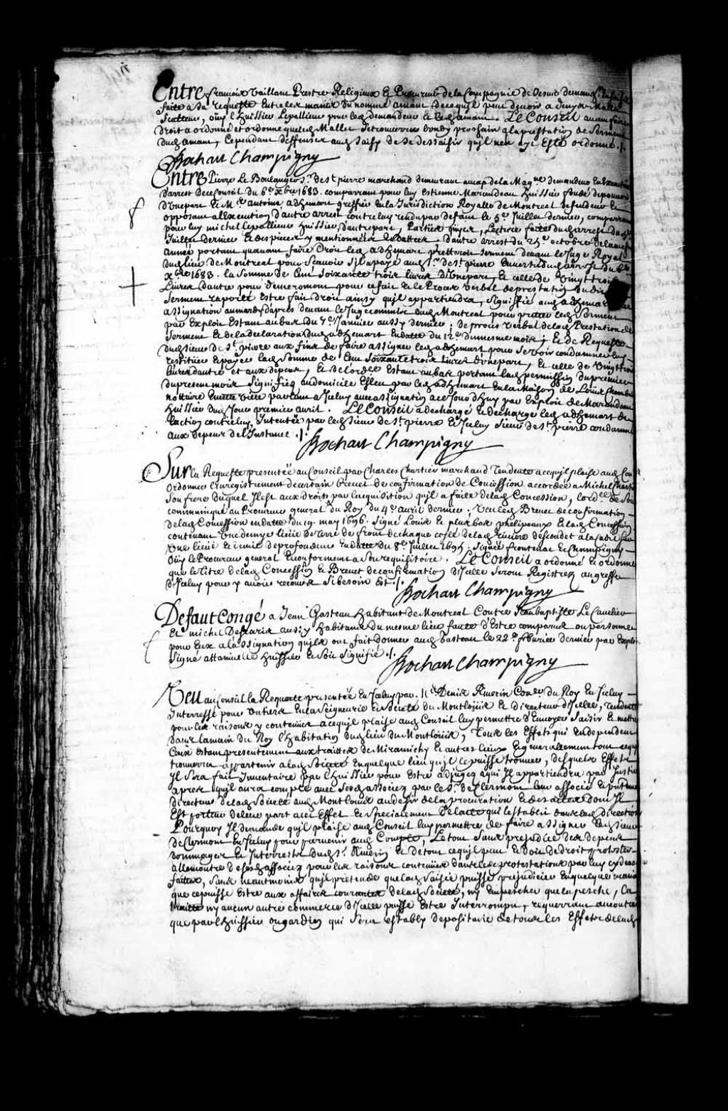 Transcription du texte avec orthographe modernisée : «Entre François VAILLANT prêtre religieux et procureur de la compagnie de Jésus demandeur en saisie faite à sa requête entre les mains du nommé amant de ce qu'il peut devoir à Denis Mallet sculpteur, ouï l'huissier Lepallieur pour ledit demandeur et ledit amant. Le Conseil avant faire droit a ordonné et ordonne que ledit Mallet se trouvera lundi prochain à la prestation de serment dudit Arnaut, cependant défenses audit saisi de se dessaisir qu'il n'en ait été ordonné. BOCHART CHAMPIGNY.»