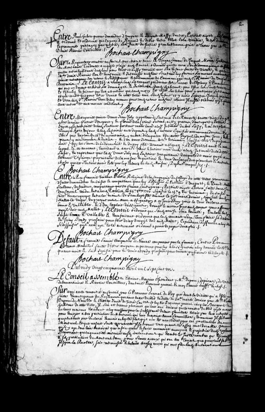 - Transcription du texte avec orthographe modernisée : «Du lundi vingt-cinquième avril mille sept cent un. Le Conseil assemblé où étaient Monsieur l'intendant, maîtres Dupont Depeiras, de Vitré, de La Martinière et Riverin conseillers, d'Auteuil procureur général et moi Peuvret greffier en chef. Sur ce qui a été remontré au Conseil par le procureur général du Roi que dans la visite qui a été faite en conséquence du règlement portant taxe du blé en date du 30e mars dernier par maître Nicolas Dupont de Neuville et Charles Denys de Vitré conseillers et lui dit procureur général chez les Bourgeois et habitant de cette ville, il s'en est trouvé plusieurs qui leur ont déclaré que le nombre de blé qu'ils avaient en leurs maisons excédant celui nécessaire pour la subsistance de leurs familles était par eux acheté pour envoyer a des particuliers de Montréal qui leur en avaient donné commission, et comme il se trouve que plusieurs ont déclaré en avoir acheté plus qu'il n'en est nécessaire pour ces particuliers de Montréal et que même sous ce prétexte il se trouve une quantité assez considérable pour qu'il y ait tout lieu de croire que ce soit pour en faire commerce au mépris et préjudice dudit règlement requérant que la quantité contenue aux dites déclarations qui excède le juste nombre qui est nécessaire auxdits particuliers de Montréal tant pour semer à ceux qui ont des terres que pour leur subsistance jusqu'à la récolte, soit retranchée et enlevée de chez ceux qui ont fait lesdites déclarations pour être lesdits Grains distribués aux pauvres pour semer en leur payant six livres cinq sols par chacun minot, savoir 6 livres suivant la taxe et lesdits cinq sols pour le port, et ce suivant la réduction qui en a été faite en ce dit Conseil aux dénommés au procès-verbal desdits sieurs commissaires et l'état qui en a été fait. Le Conseil conformément audit réquisitoire a ordonné et ordonne que toute la quantité de blé ainsi déclarée et surpasse le juste nombre nécessaire aux particuliers dudit Montréal suivant le retranchement fait par ce dit Conseil dont l'état sera signé par Monsieur l'intendant et le greffier dudit Conseil, sera prise, enlevée et transportée de chez les propriétaires chez le sieur Georges Regnard Duplessis trésorier de la marine en ce pays, en payant auxdits propriétaires la somme de six livres cinq sols par chacun minot, pour être lesdits blés distribués par ledit sieur Duplessis aux pauvres habitants pour semer suivant les billets qui seront donnés par lesdits sieurs Dupont, de Vitré et ledit procureur général, lequeldit sieur Duplessis n'en pourra distribuer à qui que ce soit qu'en payant à ceux qui en voudront recevoir le même prix de six livres cinq sols. BOCHART CHAMPIGNY.»
