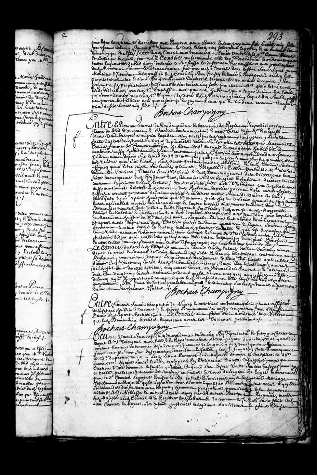 Transcription du texte avec orthographe modernisée : «Vu par le Conseil son arrêt du 14e mars dernier rendu sur requête présentée en icelui par Charles Lemoyne (Lemoine) écuyer sieur de Longueuil aux fins d'enregistrement des lettres patentes de sa Majesté à lui accordées portant érection en baronnie de sa terre et seigneurie de Longueuil, ledit arrêt portant qu'avant faire droit il serait fait information du contenu en icelles; ladite information faite en conséquence le 23e du présent mois; lesdites lettres patentes de sa Majesté données à Versailles le 26e janvier 1700 signées Louis et sur le repli par le Roi Phelipeaux et à côté visa Phelipeaux pour érection d'une baronnie en Canada, scellées du grand sceau en cire verte sur laque de soie cramoisie et verte, par lesquelles pour les causes y contenues la terre de Longueuil est érigée en baronnie pour le sieur Charles Lemoyne écuyer et ses enfants et successeurs nés en légitime mariage voulant sa Majesté qu'ils se puissent dire, nommer et qualifier barons en tous actes et qu'ils jouissent des droits d'armes, blasons, honneurs, prérogatives, prééminences en fait de guerre assemblée de noblesse et autres droits ainsi que les autres barons du royaume, mandant sa dite Majesté à ce dit Conseil d'en registrer lesdites lettres et du contenu en icelles faire jouir ledit sieur Charles Lemoyne, ses enfant, postérité et légitimes successeur et ayant cause pleinement, paisiblement et perpétuellement cessant et faisant cesser tous troubles et empêchements à ce contraires, et les conclusions du procureur général du Roi du 24 dudit présent mois. Le Conseil conformément aux dites conclusions a ordonné et ordonne que lesdites lettres patentes seront registrées au greffe d'icelui pour jouir par l'impétrant, ses enfant, postérité et légitime successeurs du contenu en icelles et y avoir recours si besoin est, BOCHART CHAMPIGNY.»