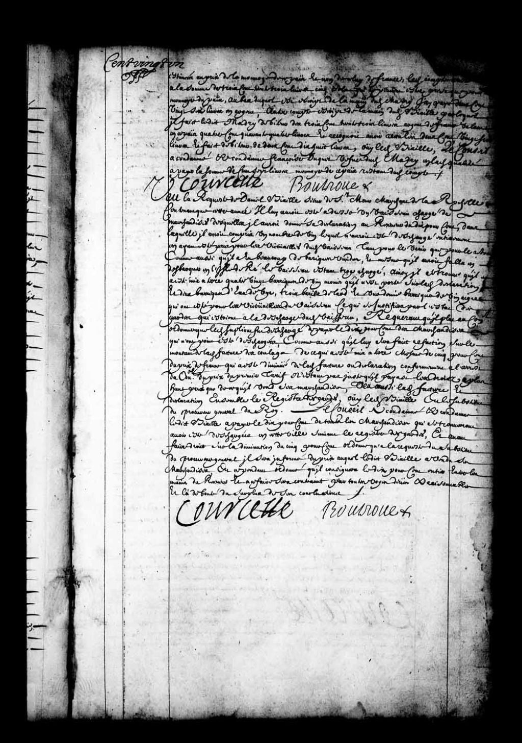 Transcription du texte avec orthographe modernisée : «Vu la requête de Daniel Biaille sieur de Saint-Meur, marchand de La Rochelle, contenant que cette année il lui aurait été adressé un vaisseau chargé de marchandises, desquelles il aurait donné sa déclaration au receveur du dix pour-cent, dans laquelle il aurait compris un nombre de vin lequel n'aurait été déchargé entièrement en ayant été pris pour les victuailles dudit vaisseau tant pour le venir que pour le retour, comme aussi qu'il a eu beaucoup de barriques vides, et même qu'il aurait fallu en débarquer en l'île de Ré, le vaisseau étant trop chargé, ainsi il se trouve qu'il a été mis à terre quatre-vingt barriques de vin moins qu'il n'est porté sur ladite déclaration, et deux barriques d'eau-de-vie, trois barils de lard et une demie barrique de vinaigre qui ont été pour les victuailles du vaisseau, ce qui se justifiera par l'état des gardes qui étaient à la décharge dudit vaisseau. Requérant qu'il plût au Conseil ordonner que ledit suppliant fut déchargé de payer le dix pour-cent des marchandises qui n'ont point été déchargées, comme aussi qu'il lui sera fait réfaction, sur le montant de ladite facture des coulages de ce qui a été mis à terre même de cinq pour-cent du prix de France qui a été diminué de ladite facture ou déclaration conformément à l'arrêt du Conseil du prix du premier tarif, n'étant pas juste qu'il payât les droits a plus haut prix que ce qu'il vend ses marchandises; vu aussi ladite facture et déclaration, ensemble le registre des gardes; ouï ledit Biaille et le substitut du procureur général du Roi. Le Conseil a condamné et condamne ledit Biaille à payer le dix pour-cent de toutes les marchandises qui se trouveront avoir été déchargées en cette ville suivant le registre des gardes, et avant faire droit sur la diminution du cinq pour-cent, ordonne qu'à la requête du substitut du procureur général il sera informé du prix auquel ledit Biaille a vendu ses marchandises, et cependant ordonné qu'il consignera le dix pour-cent entier entre les mains du receveur, et à ce faire sera contraint par toutes voies dues et raisonnables, et l'a débouté du surplus de ses conclusions. COURCELLE BOUTROUE.»