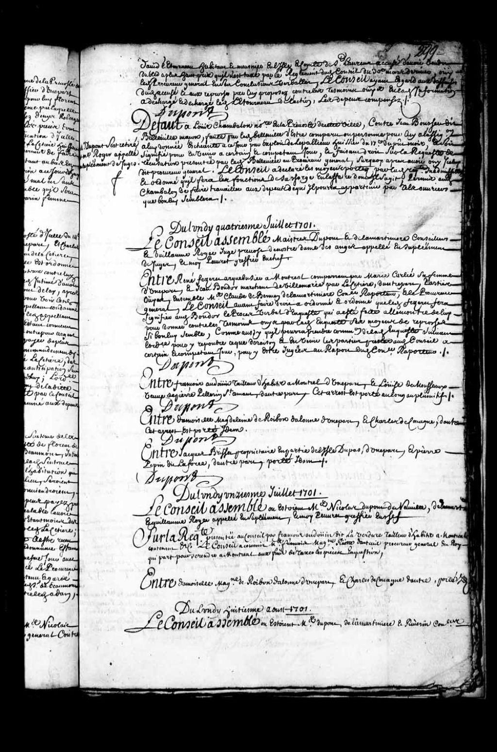 Arrêt porté au plumitif dans la cause de Madeleine de Roybon d'Alonne, contre Charles de Couagne, marchand bourgeois de Montréal, 4 juillet 1701, Archives nationales à Québec, Fonds Conseil souverain, (03Q,TP1,S28,P6667).