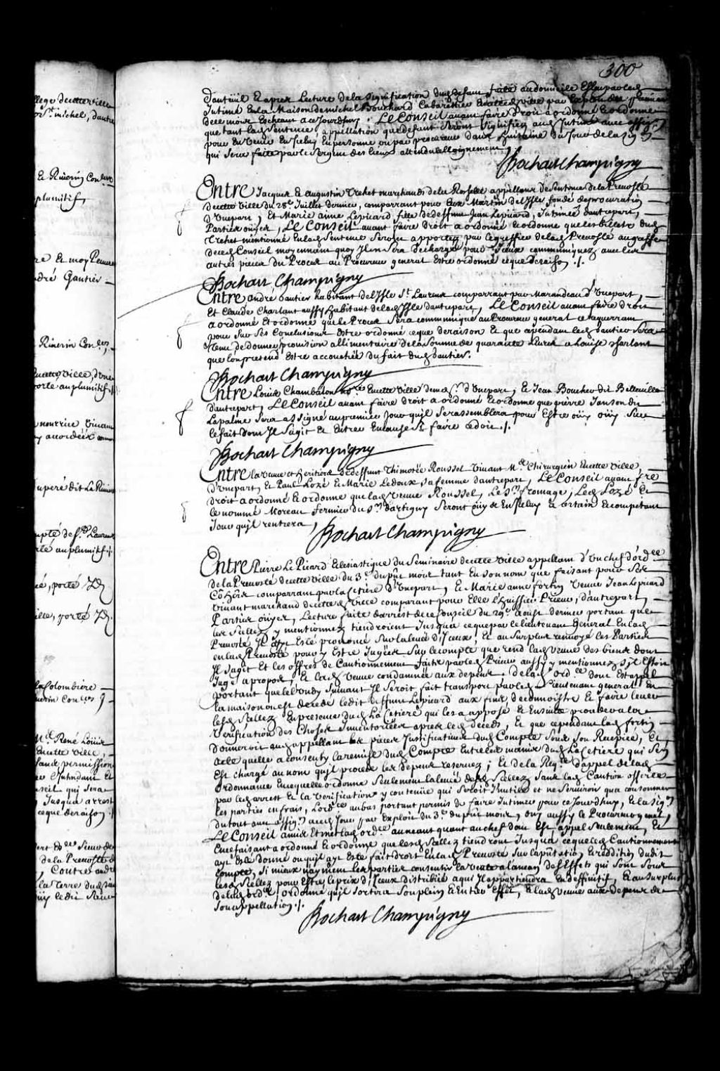 Transcription du texte avec orthographe modernisée : «Entre la veuve et héritiers de défunt Timothée Roussel vivant maître chirurgien en cette ville d'une part, et Paul LOSÉ (Lauzé) et Marie LEDOUX sa femme d'autre part, le Conseil avant faire droit a ordonné et ordonne que ladite veuve Roussel, le sieur Fromage, ledit Losé et le nommé Moreau fermier du sieur Dartigny seront ouïs en icelui à certain et compétent jour qu'il rentrera. BOCHART CHAMPIGNY.»