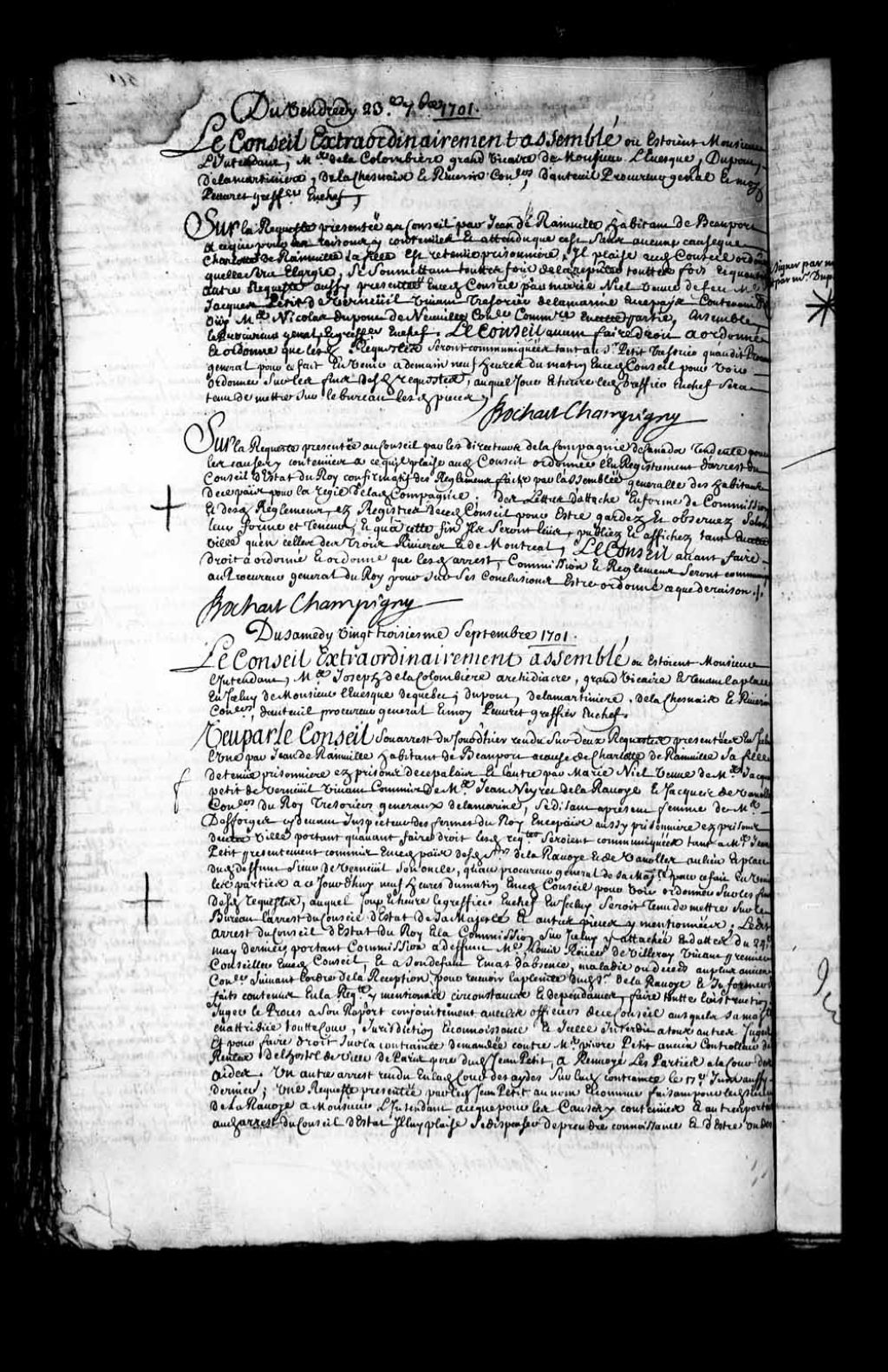 - Transcription du texte avec orthographe modernisée : «Du samedi vingt-troisième septembre 1701 [En réalité le samedi est le 24. Correction faite dans la version du cahier 13 et dans dans le 10]. Le Conseil extraordinairement assemblé où étaient Monsieur l'intendant, maître Joseph de la Colombière (Lacolombière) archidiacre, grand vicaire et tenant la place en icelui de Monsieur l'évêque de Québec; Dupont, de La Martinière, de Lachesnais et Riverin conseillers d'Auteuil procureur général et moi Peuvret greffier en chef. Vu par le Conseil son arrêt du jourd'hier rendu sur deux requêtes présentées en icelui l'une par Jean de Rainville habitant de Beauport à cause de Charlotte de Rainville sa fille détenue prisonnière des prisons de ce palais et l'autre par Marie Niel veuve de maître Jacques Petit de Verneuil vivant commis de maître Jean Neyret de la Ravoye et Jacques de Vanolles conseillers du Roi trésoriers généraux de la marine, se disant à présent femme de maître Desforges ci-devant inspecteur des fermes du Roi en ce pays aussi prisonnière des prisons de cette ville portant qu'avant faire droit lesdites requêtes seraient communiquées tant à Monsieur Jean Petit présentement commis en ce dit pays desdits sieurs de La Ravoye et de Vanolles au lieu et place dudit défunt sieur de Verneuil son oncle, qu'au procureur général de sa Majesté pour ce fait en venir les parties à ce jourd'hui neuf heures du matin en ce dit Conseil pour voir ordonner sur les fins desdites requêtes, auquel jour et heure le greffier en chef en icelui serait tenu de mettre sur le bureau l'arrêt du Conseil d'état de sa Majesté et autres pièces y mentionnées; ledit arrêt du Conseil d'état du Roi et la commission sur icelui y attachée en dates du 24e mai dernier, portant commission a défunt maître Louis Rouer de Villeray vivant premier conseiller en ce dit Conseil, et à son défaut en cas d'absence, maladie ou décès au plus ancien conseiller suivant l'ordre de la réception pour recevoir la plainte dudit sieur de La Ravoye et informer des faits contenus en la requête y mentionnée circonstances et dépendances, faire toute l'instruction et juger le procès à son rapport conjointement avec les officiers de ce Conseil auxquels sa Majesté en attribue toute Cour, juridiction et connaissance et icelle interdit à tous autres juges, et pour faire droit sur la contrainte demandée contre maître Pierre Petit ancien contrôleur des rentes de l'hôtel de ville de Paris père dudit Jean Petit, a renvoyé les parties à la Cour des aides; un autre arrêt rendu en ladite Cour des aides sur ladite contrainte le 17e juin aussi dernier; une requête présentée par ledit Jean Petit au nom et comme faisant pour ledit sieur de LaRanvoye à Monsieur l'intendant à ce que pour les causes y contenues et autres portées audit arrêt du Conseil d'état il lui plaise se dispenser de prendre connaissance et d'être un des juges du fait dont il s'agit; une autre requête aussi présentée par ledit sieur Petit à ce dit Conseil contenant ses moyens de récusation à l'encontre de mondit sieur l'intendant, ouï mondit sieur l'intendant tant sur le contenu de l'exposé audit arrêt du Conseil d'état que desdites requêtes, et icelui retiré, ouï aussi le procureur général du Roi en ses réquisitoire ou conclusions qu'il a mis par écrit. Le Conseil faisant droit sur ladite récusation a déclaré et déclare les moyens portés lesdites requêtes inadmissibles et ordonné que mondit sieur l'intendant demeurera juge avec le Conseil du procès en question, et icelui rentré et ayant pris sa place, ledit Conseil faisant droit sur les fins des requêtes desdits de Rainville et Marie Niel énoncées audit arrêt du jourd'hier a ordonné et ordonne que sans avoir égard en l'exposé en icelles et conformément audit arrêt du Conseil d'état du Roi que ledit sieur Dupont continuera l'instruction du procès. BOCHART CHAMPIGNY.»