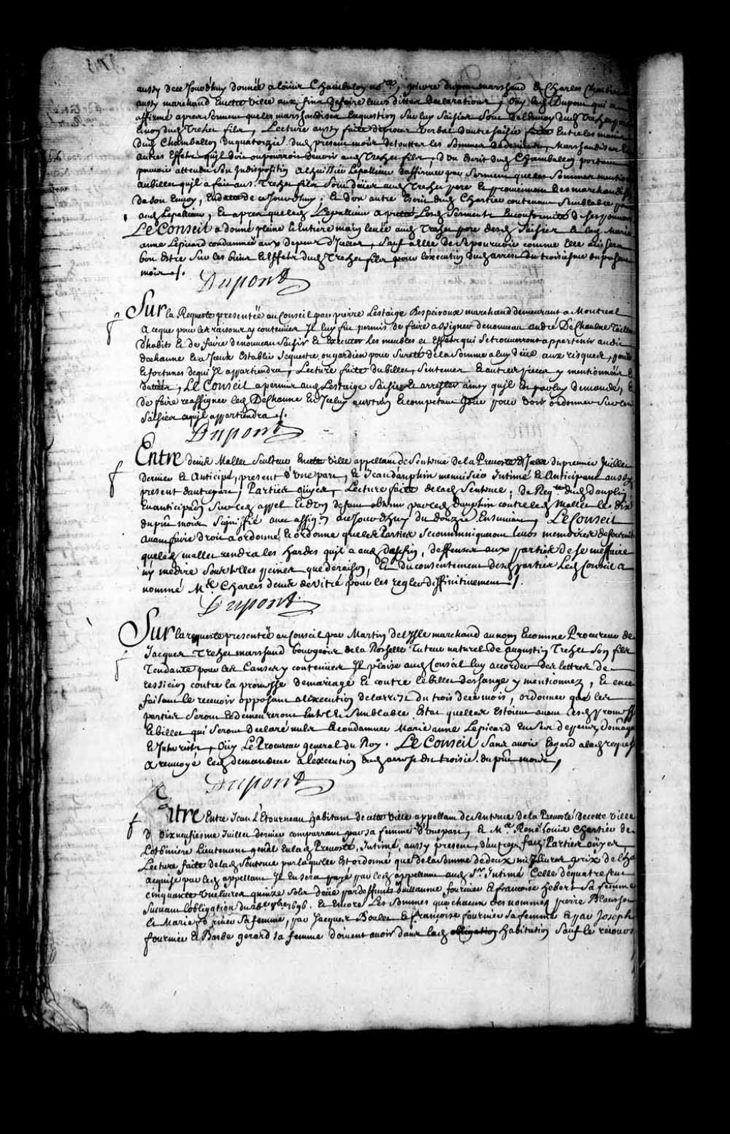 - Transcription du texte avec orthographe modernisée : «Entre Jean Létourneau habitant de cette ville appelant de sentence de la prévôté de cette ville du dix-neuvième juillet dernier comparant par sa femme d'une part, et maître René Louis CHARTIER DE LOTBINIERE lieutenant général en ladite prévôté, intimé, aussi présent, d'autre part. Parties ouïes, lecture faite de ladite sentence par laquelle est ordonné que de la somme de deux mille livres prix de l'habitation acquise par ledit appelant il en sera payé par ledit appelant audit sieur intimé celle de quatre cent cinquante et une livres quinze sols due par défunts Guillaume Fournier et Françoise Hébert sa femme suivant l'obligation du 26e octobre 1696. Et encore les sommes que chacun des nommés Pierre Blanchet et Marie Fournier sa femme, par Jacques Boulet et Françoise Fournier sa femme et par Joseph Fournier et Barbe Gérard (Girard) sa femme doivent avoir dans ladite habitation sauf le recours dudit appelant à l'encontre de qui il avisera bon être et ledit appelant aux dépens, et sursis à faire droit sur la somme de soixante et une livres dix-sept demandée à compte courant après avoir ouï les parties intéressées à ce sujet et aussi sauf le recours dudit sieur intimé pour le surplus de ce qui lui sera dû par lesdits Blanchet, Joseph Fournier et Boullet, ladite sentence signifiée audit appelant avec commandement d'y satisfaire par exploit du premier septembre dernier, signé Lacetière, et des pièces y mentionnées et datées, le Conseil a mis et met ladite appellation au néant ordonne que ladite sentence sera exécutée selon sa forme et teneur, si mieux n'aime ledit appelant abandonner audit sieur intimé les trois parts de ladite habitation à lui vendues par lesdits Blanchet, Joseph Fournier et boullet, et ledit appelant aux dépens de grâce sans amende. DUPONT.»