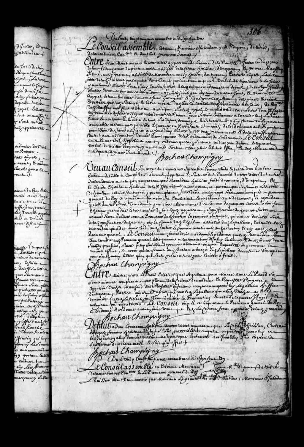 Transcription du texte avec orthographe modernisée : «Défaut à Jean Etourneau (Létourneau) habitant de cette ville comparant par Lacetière huissier, contre Joseph Fournier habitant du fief Saint-Luc Faute d'être comparu ou personne pour lui à l'assignation à lui donnée parlant à sa personne échéante à ce jourd'hui par exploit du septième du présent mois et soit signifié. BOCHART CHAMPIGNY.»