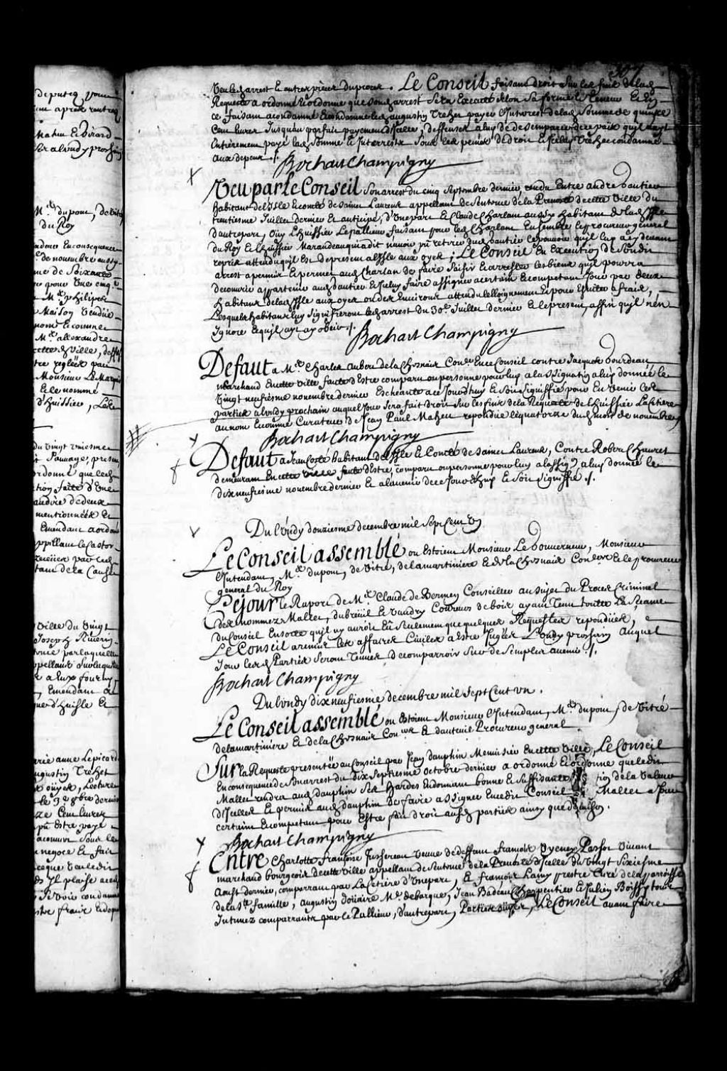 - Transcription du texte avec orthographe modernisée : «Du lundi douzième décembre mille sept cent un. Le Conseil assemblé où étaient Monsieur le gouverneur, Monsieur l'intendant, maîtres Dupont, de Vitré, de La Martinière, et de Lachesnais conseillers et le procureur général du Roi. Ce jour le rapport de maître Claude de Bermen conseiller au sujet du procès criminel des nommés Mallet, Dubreuil et Vaudry coureurs de bois ayant tenu toute la séance du Conseil en sorte qu'il n'y aurait eu seulement que quelques requêtes répondues, le Conseil a remis les affaires civiles à être jugées lundi prochain auquel jour lesdites parties seront tenues de comparoir sur de simples avenir. BOCHART CHAMPIGNY. Du lundi douzième décembre mille sept cent un. Le Conseil assemblé où étaient Monsieur le gouverneur, Monsieur l'intendant, maîtres Dupont, de Vitré, de La Martinière et de Lachesnais conseillers et d'Auteuil procureur général du Roi. Sur le rapport [...]