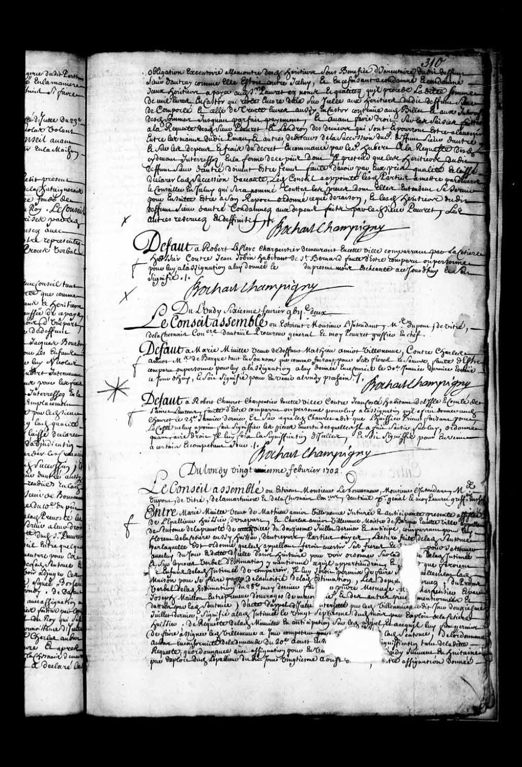 Transcription du texte avec orthographe modernisée : «Du lundi sixième février mille sept cent deux. Le Conseil assemblé où étaient Monsieur l'intendant, maîtres Dupont, de Vitré, de Lachesnais conseillers d'Auteuil procureur général et moi Peuvret greffier en chef. Défaut à Marie Miville veuve de défunt Mathieu Amiot Villeneuve, contre Charles Amiot maître de barque tant en son nom que comme faisant pour ses frères et soeurs, faute d'être comparu ou personne pour lui à l'assignation à lui donnée en ce Conseil le 30e janvier dernier échue ce jourd'hui, et soit signifié pour en venir à lundi prochain. BOCHART CHAMPIGNY.»