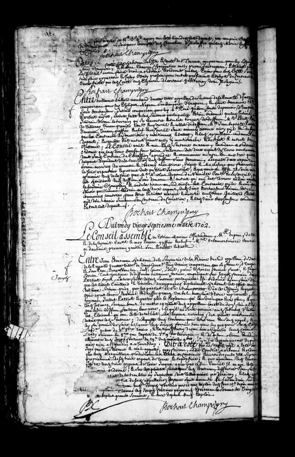 Transcription du texte avec orthographe modernisée : «Entre Jean Côté fils habitants de l'île et compté de Saint-Laurent, comparant pour lui l'huissier Prieur, d'une part, et Robert CHAURET (Choret) charpentier aussi présent, d'autre part. Parties ouïes, le Conseil avant faire droit a ordonné et ordonne que ledit Prieur pour ledit Côté sera tenu faire apparoir en icelui lundi prochain pour toutes préfixions et délais du contrat de vente faite par ledit Côté audit Chauret de certaine habitation dont il s'agit. BOCHART CHAMPIGNY.»