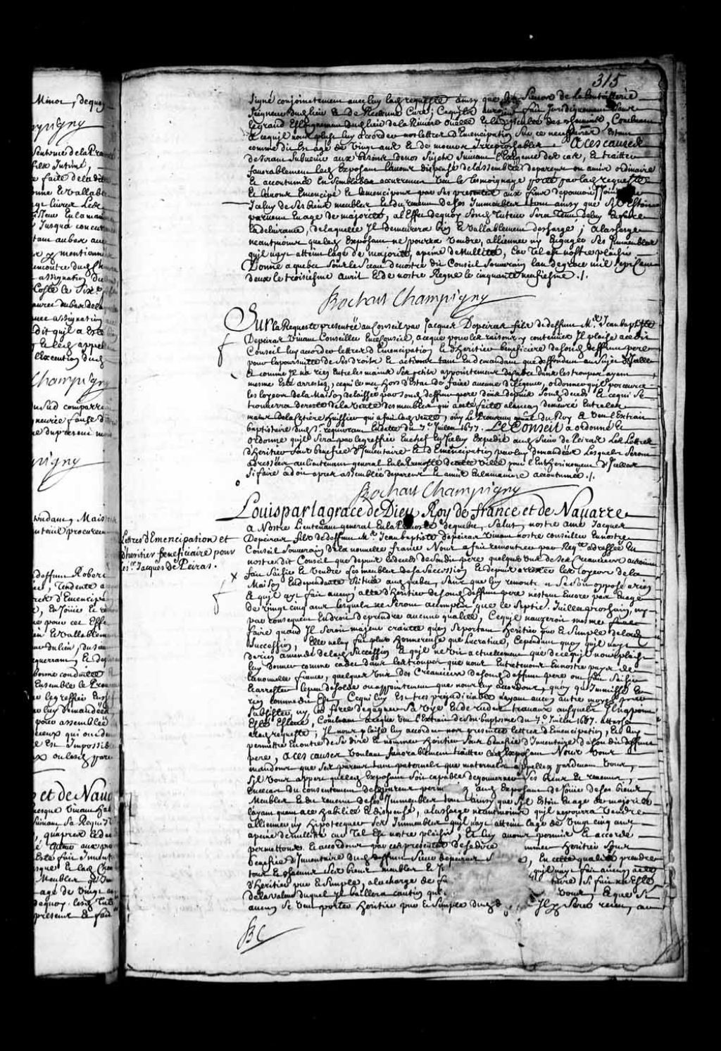 Transcription du texte avec orthographe modernisée : «Lettre d'émancipation et d'héritier bénéficiaire pour le sieur Jacques dePeiras. Louis par la grâce de Dieu Roi de France et de Navarre à notre lieutenant général en la prévôté de Québec, Salut, notre aîné Jacques Depeiras fils de défunt maître Jean-Baptiste Depeiras vivant notre conseiller en notre Conseil souverain de la Nouvelle-France Nous a fait remontrer par requête adressée en notre dit Conseil que depuis le décès de sondit père quelques-uns de ses créanciers auraient fait saisir et vendre les meubles de sa succession et depuis arrêter les loyers de la maison en dépendante située audit Québec, sans que lui remontrant se soit opposé a rien et qu'il ait fait aucun acte d'héritier de sondit défunt père n'étant encore pas en âge de vingt-cinq ans lesquels ne seront accomplis que le septième juillet prochain, ni par conséquent en droit de prendre aucune qualité, ce qu'il n'oserait même faire quand il serait majeur crainte qu'en se portant héritier pur et simple de ladite succession, elle ne lui fut plus onéreuse que Lucrative, cependant quoi qu'il n'ait de rien amendé de ladite succession et qu'il ne vit actuellement que de ce qu'il nous plaise lui donner comme cadet dans les troupes que nous entretenons en notre pays de la Nouvelle-France, quelques-uns des créanciers de sondit défunt père ont fait saisir et arrêter le peu de solde ou appointement que nous lui accordons, quoi qu'immiscé en rien comme dit est, ce qui lui est très préjudiciable n'ayant aucun autre moyen pour subsister, ni la forcé de gagner sa vie en de rudes travaux auxquels il n'a point été élevé, concluant à ce que vu l'extrait de son baptême du 7e juillet 1677 attaché à ladite requête; il nous plaise lui accorder nos présentes lettres d'émancipation et lui permettre en outre de se dire et nommer héritier sous bénéfice d'inventaire de sondit défunt père, à ces causes voulant favorablement traiter ledit exposant Nous vous mandons que ses parents tant paternels que maternels appelés par-devant Vous, s'il vous appert que ledit exposant soit capable de gouverner ses biens et revenus, en ce cas du consentement desdits parents permettiez audit exposant de jouir de ses biens meubles et du revenu de ses immeubles tout ainsi que s'il était en âge de majorité l'ayant quant à ce habilité et dispensé, à la charge néanmoins qu'il ne pourra vendre aliéner ni hypothéquer ses immeubles qu'il n'ait atteint l'âge de vingt-cinq ans à peine de nullité car tel est notre plaisir, et lui avons permis et accordé permettons et accordons par ces présentes de se dire et nommer héritier sous bénéfice d'inventaire dudit défunt sieur Depeiras son père, en cette qualité prendre tous et chacun ses biens meubles et immeubles pourvu qu'il n'ait fait aucun acte d'héritier pur et simple, à la charge de faire bon et fidèle inventaire si fait n'a été, de la valeur duquel il baillera caution qui sera reçu par-devant vous, et que si aucun se veut porter héritier pur et simple dudit défunt il y sera reçu, car tel est aussi notre plaisir, donné à Québec en notre dit Conseil souverain l'an de grâce le troisième avril mille sept cent deux, et de notre règne le cinquante-neuvième. BOCHART CHAMPIGNY.»