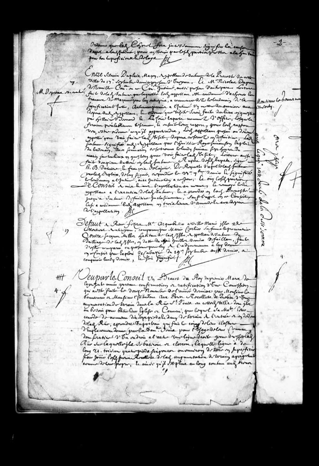 - Transcription du texte avec orthographe modernisée : «Vu par le Conseil un brevet du Roi du premier mars de la présente année, portant confirmation et ratification d'une concession qui a été faite le douze novembre de l'année dernière, par Monsieur le gouverneur et Monsieur l'intendant aux pères récollets de Québec, d'une augmentation de terrain dans la rue Saint-Louis en cette dite ville dont ils ont besoin pour bâtir leur église et couvent; par lequel sa Majesté leur concède de nouveau dix-sept pieds et demi de terrain à l'entrée et au-dedans de ladite rue, à prendre du poteau qui fait le coin de leur clôture d'emplacement donné par la demoiselle Denis pour l'usage de leur couvent, dont sera tiré d'un endroit à l'autre une ligne droite pour dresser ladite rue, sur laquelle ils se bâtiront et cloront, laquelle ligne a de long vingt et une toises quatre pieds six pouces ou environ de terre en superficie, pour jouir lesdits pères récollets de ladite augmentation de terrain a perpétuité comme de leur propre, et ainsi qu'il est plus au long contenu audit brevet signé Louis et plus bas Phelippeaux. Requête présentée en ce Conseil par le père Hyacinthe Perrault commissaire provincial de toutes les missions des récollets en ce pays et gardien du couvent en cette ville, tendante à ce qu'il soit ordonné que ledit brevet sera registré, au bas de laquelle est le soit montré. Conclusions du procureur général du Roi, du jourd'hier, et ouï le rapport de maître Louis Rouer de Villeray, premier conseiller, le Conseil a ordonné et ordonne que ledit brevet sera registré au greffe d'icelui, ensemble ladite concession, pour jouir par lesdites pères récollets du contenu en iceux, sans qu'ils y puissent être troublés à l'avenir. Monsieur le gouverneur est sorti. Monsieur de Villeray rapporteur. BOCHART CHAMPIGNY ROUER DE VILLERAY.»
