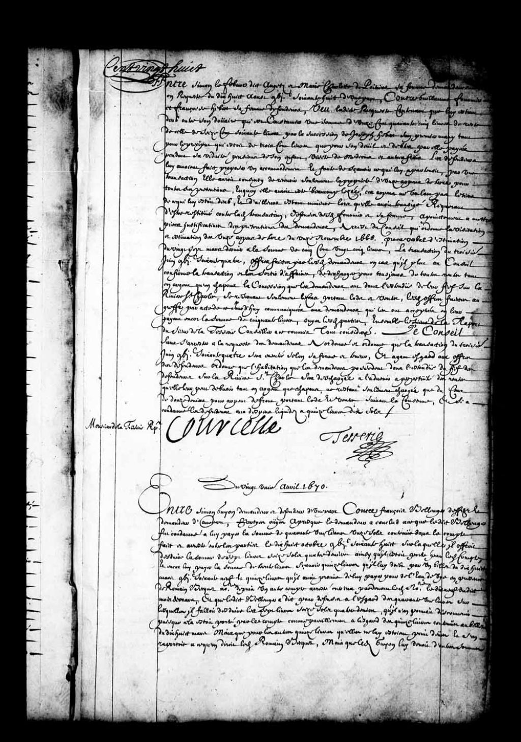 - Transcription du texte avec orthographe modernisée : «Du vingt et unième avril 1670. Entre Simon GUYON demandeur et défendeur d'une part contre François BELLENGER défendeur et demandeur d'autre part. Parties ouïes, après que le demandeur a conclu à ce que ledit Bellenger fut condamné à lui payer la somme de quarante et une livres onze sols contenue dans le compte fait et arrêté entre les parties le dix-huit octobre mille six cent soixante-huit, sur laquelle il offrait déduire la somme de sept livres seize sols quatre deniers ainsi qu'il était porté par ledit compte, et encore lui payer la somme de trente livres, savoir quinze livres qu'il lui doit par un billet du dix-huit mars mille six cent soixante-neuf, et quinze livres qu'il avait promis lui payer pour de l'eau-de-vie en présence de Romain Becquet notaire depuis un autre compte arrêté entre eux par-devant ledit notaire le dix-neuf dudit mois de mars, et que ledit Bellenger a dit pour défenses à l'égard des quarante et une livres sur lesquelles il fallait déduire les sept livres seize sols quatre deniers, qu'il n'en pouvait disconvenir puisque cela était porté par le compte comme pareillement à l'égard des quinze livres contenues au billet du dix-huit de mars, mais que pour les autres quinze livres, qu'elles ne lui étaient point dues et s'en rapportait à ce qu'en dirait ledit Romain Becquet, mais que ledit Guyon lui devait d'autres sommes considérables sur lesquelles il fallait déduire ce qu'il lui demandait et qui étaient contenues dans le mémoire qu'il représentait composé de sept articles. Le premier de deux cent cinquante livres restant de trois cents livres qu'il devait payer au magasin à son acquit et se trouvait qu'il n'en avait payé que cinquante livres; le deuxième de trente livres pour avoir traîné de la pierre avec un homme et deux boeufs pendant dix jours; le troisième de quarante livres pour l'hivernement d'une vache et deux veaux; le quatrième pour seize planches de huit livres; le cinquième pour la septième partie d'un boeuf, huit livres dix sols; le sixième pour deux boisseaux d'orge; et le septième pour an prétendu logement de lui, sa femme et un homme dont il n'y a point de somme tirée; ouï ledit Guyon sur le mémoire qui a dit que c'était de vieilles dettes de quatorze ou quinze ans qu'il voulait faire revivre et qui étaient comprises et acquittées par les comptes faits entre eux les dix-huit octobre mille six cent soixante-huit et dix-neuf mars mille six cent soixante-neuf remarqués ci-dessus, étant toutes lesdites dettes ou pour affaires concernant la succession de leurs père et mère et affaires qu'ils avaient entre eux avant ledit compte du dix-huitième octobre, ou pour une société dont ils avaient terminé tous les différent par celui du dix-neuf mars ainsi qu'il pouvait se justifier par la lecture d'iceux, que pour l'article premier c'était un fait de la succession arrivé lorsque lui Guyon était comme serviteur chez son père dont il n'était tenu et avait été compris dans les prétentions communes, pour le deuxième qu'il l'avait récompensé lui ayant laissé deux boeufs entre les mains pendant deux ans, desquels il s'était servi, le troisième il avait aussi récompensé d'ailleurs et faisait une des prétentions terminées, le quatrième était pour planches employées à bâtir le cabinet où étaient enfermées les marchandises de leur société, que ce fait avait été vidé par le compte du dix-neuf mars; le cinquième était pour un boeuf de la succession qui était compris dans l'accord du dix-huit octobre; le sixième lui avait donné deux boisseaux d'autres grains, et d'ailleurs ces deux boisseaux d'orge étaient deux aux marguilliers de l'église et qu'il les avait payés; que le dernier faisait aussi une des prétentions terminées par l'accord du dix-huit octobre; ouï pareillement ledit Becquet qui a déclaré que le billet de quinze livres n'était compris dans le compte du dix-neuf mars quoique fait avant icelui ainsi que ledit Bellenger en demeurait d'accord, et que pour les autres quinze livres il était vrai qu'il les avait promis audit Guyon pour le récompenser de quelque eau-de-vie ou ledit Guyon avait part et avait dit qu'il lui donnerait cette somme à prendre sur un particulier du nom duquel il ne se souvient pas; lecture faite des comptes du dix-huit octobre mille six cent soixante-huit et dix-neuf mars mille six cent soixante-neuf tout considéré, le Conseil a débouté ledit Bellenger de ses demandes et ce faisant l'a condamné et condamne à payer audit Simon Guyon la somme de trente-trois livres quatorze sols huit deniers, restant des quarante et une livres onze sols, déduction faite des sept livres seize sols quatre deniers, comme pareillement lui payer les quinze livres contenues au billet du dix-huitième mars mille six cent soixante-neuf, et les quinze livres qu'il lui a promis pour récompense de l'eau-de-vie, et aux dépens liquidés aux frais du présent arrêt. COURCELLE.»