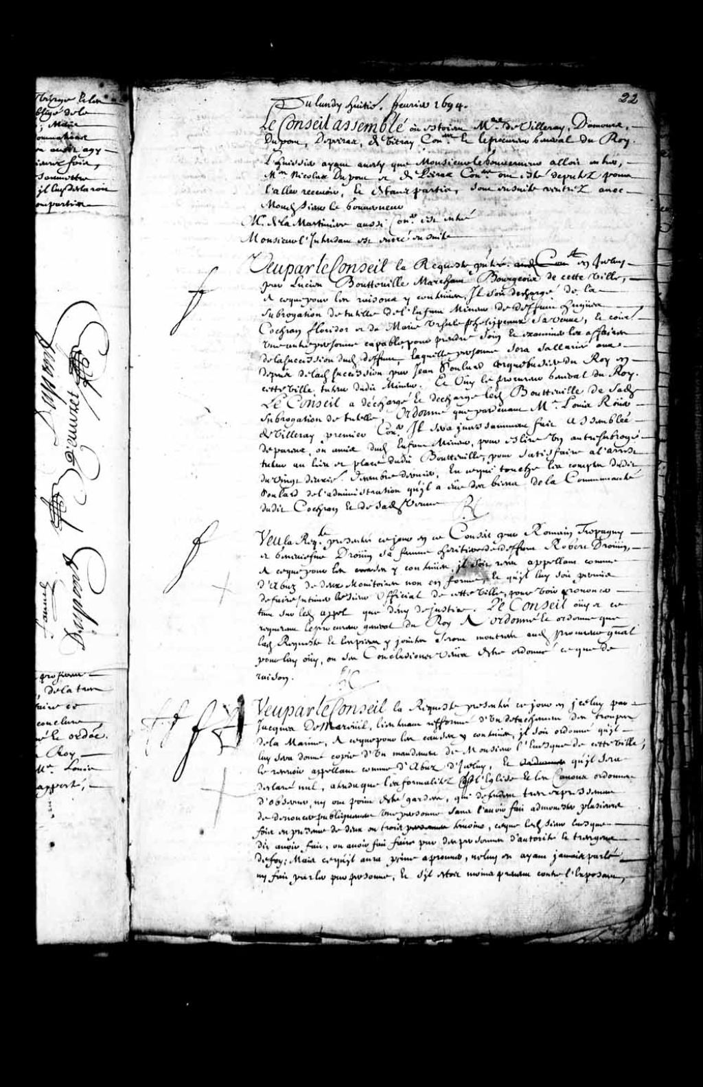 - Transcription du texte avec orthographe modernisée : «Vu par le Conseil la requête présentée ce jour en icelui par Jacques de Mareuil, lieutenant reformé du détachement des troupes de la marine, à ce que pour les causes y contenues, il soit ordonné qu'il lui sera donné copie d'un mandement de Monsieur l'évêque de cette ville, le recevoir appelant comme d'abus d'icelui, et qu'il sera déclaré nul, attendu que les formalités que l'église et les canons ordonnent d'observer, n'y ont point été gardées, qui défendent très expressément de dénoncer publiquement une personne sans l'avoir fait admonester plusieurs fois, en présence de deux ou trois témoins, ce que ledit sieur évêque dit avoir fait, ou avoir fait faire par des personnes d'autorité et des gens de foi; mais ce qu'il aura peine à prouver, ne lui en ayant jamais parlé ni fait parler par personne, et s'il était moins prévenu contre l'exposant, il ne pourrait pas ignorer qu'il a fait ses pâques l'année dernière, que depuis ce temps il a assisté les jours d'obligation au service Divin, et qu'il s'est acquitté de tous les devoirs d'un bon chrétien, que même il a fait ses dévotions le jour de Noël dernier, requiert aussi ledit exposant que les personnes que ledit sieur évêque dit lui avoir fait des rapports contre ledit exposant lui soient nommés et confrontés pour ensuite lui être son procès faits s'il est coupable, ou les punir de la même peine, s'il se trouve innocent, puisqu'autrement, tenant les choses ainsi secrètes et mettant les accusés hors d'état de pouvoir éclaircir et justifier, ce serait établir, si cette procédure extraordinaire était soufferte, quelque chose de pire que l'inquisition qui n'a jamais été introduite dans le royaume de France, et qui par conséquent ne la doit pas être dans le pays, se réservant ledit exposant ses réparations, dépens, dommages et intérêts contre ceux qu'il avisera bon être; le Conseil a ordonné et ordonne que ladite requête et les pièces y énoncées, seront communiquées au procureur général du Roi, ce requérant, pour lui ouï, ou ses conclusions vues; être ordonné ce que de raison. BOCHART CHAMPIGNY.»