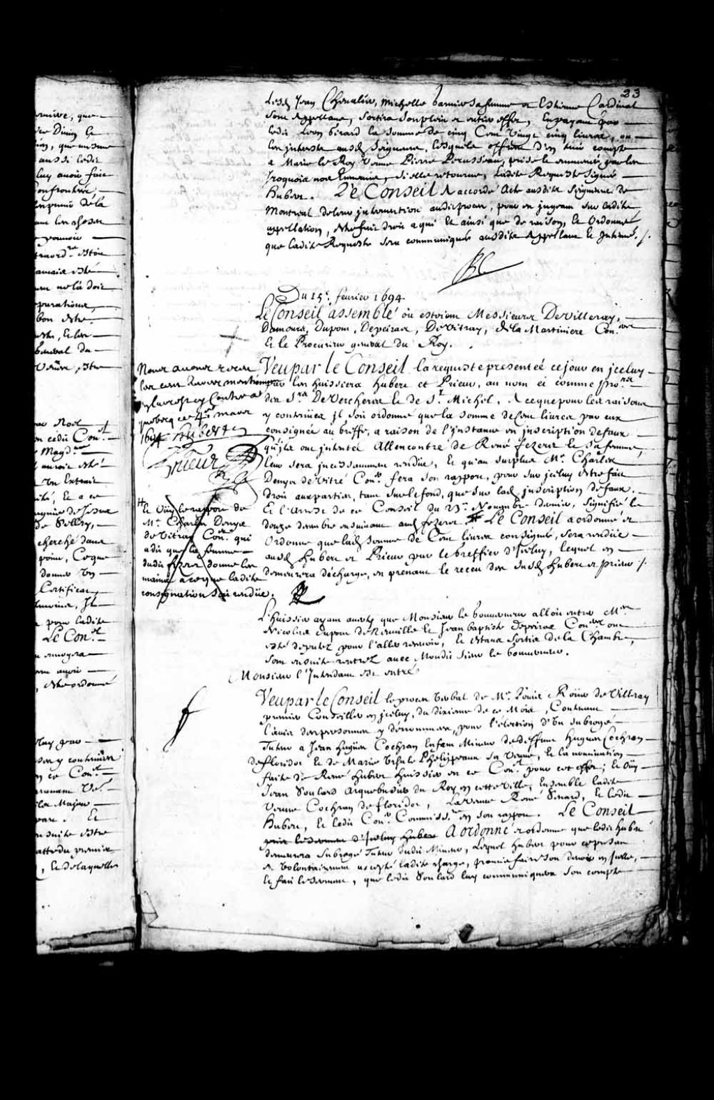 Députation des sieurs Dupont et de Peiras, conseillers, pour aller recevoir Monsieur le Gouverneur, 15 février 1694, Archives nationales à Québec, Fonds Conseil souverain, (03Q,TP1,S28,P6907).