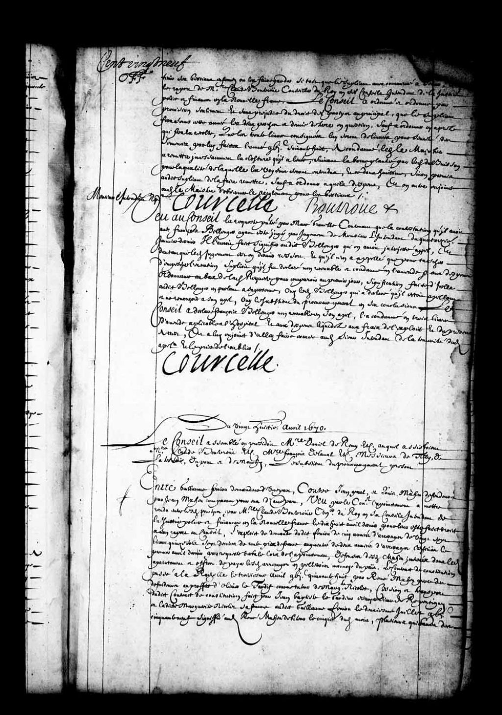 - Transcription du texte avec orthographe modernisée : «Du vingt-huitième avril 1670. Le Conseil assemblé où présidait messire Daniel de Rémy etc, auquel assistaient messire Claude Bouteroue etc. messire François de Laval etc. messieurs de Tilly, de La Tesserie, Dupont et de Mouchy, le substitut du procureur présent; entre Guillaume FENIOU demandeur d'une part, contre Jean-Paul, et Louis MAHEU défendeurs, par Jean Maheu comparant pour eux d'autre part, vu par le Conseil l'appointement à mettre rendu entre lesdites parties par messire Claude Bouteroue, conseiller du Roi en ses Conseils intendant de la justice police et finances en la Nouvelle-France, le dix-huit avril dernier pour leur être fait droit à son rapport au Conseil; l'exploit de demande dudit Feniou de cinq années d'arrérages de vingt-sept livres quinze sols sept deniers de rente prix de France augmentée de deux années d'arrérages échues le premier avril dernier par requête [...]