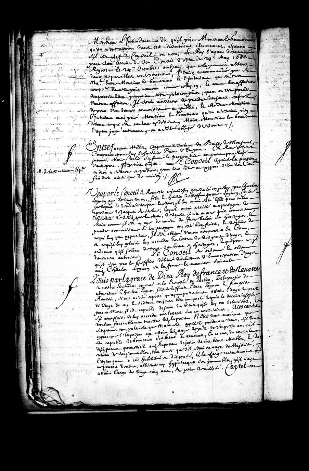 - Transcription du texte avec orthographe modernisée : «Vu par le Conseil la requête ce jourd'hui présentée en icelui par Charles Lognon (Loignon) âgé de vingt et un an fils et héritier de défunt Pierre Loignon, contenant que depuis le décès de ses père et mère il lui avait été élu pour tuteur la personne de Jacques Asselin, lequel aurait assisté aux partages de l'hérédité de sesdits père et mère desquels il n'a encore pris connaissance, mais comme il est en âge de raison, de faire valoir ses héritages et prendre connaissance si les partages ont été bien faits, et de jouir de ce qui lui peut appartenir, il est obligé d'avoir recours à la Cour, à ce qu'il lui plaise lui accorder des lettres de dispenses d'âge, et ordonner qu'il jouira de tous ses biens et héritages et que pour ce il demeurera autorisé, le Conseil a ordonné et ordonne qu'il sera par le greffier délivré des lettres d'émancipation d'âge audit Charles Lognon (Loignon) en la forme et manière suivante. BOCHART CHAMPIGNY.»