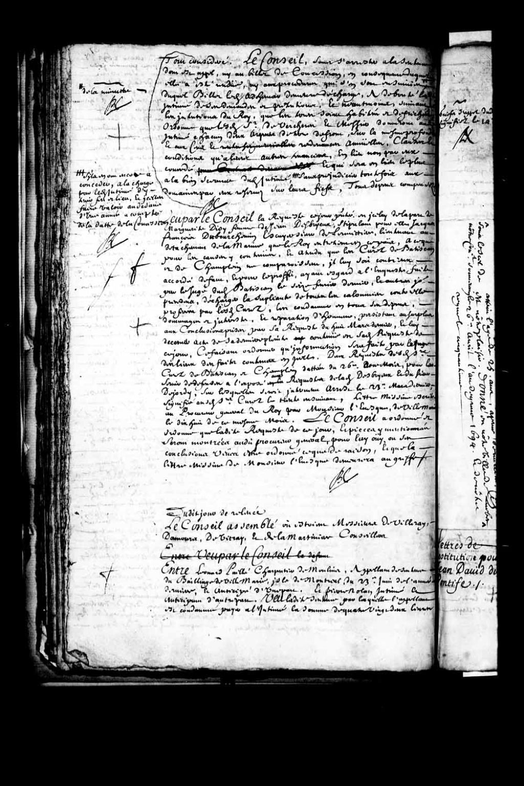 Transcription du texte avec orthographe modernisée : «Dudit jour de relevée. Le Conseil assemblé où étaient Maîtres Louis Rouer de Villeray premier conseiller. Mathieu D'Amours Dechaufour. Charles Denys de Vitray. Et Claude Bermen de la Martinière conseillers. Monsieur de Villeray président. Entre Léonard PAILLÉ charpentier de moulins, appelant de sentence du bailliage de Ville-Marie, île de Montréal du vingt-trois juin de l'année dernière, et anticipé d'une part, et Pierre NOLAN intimé anticipant d'autre part. Vu ladite sentence par laquelle l'appelant est condamné payer à l'intimé la somme de quatre-vingt-deux livres deux sols six deniers avec dépens taxés à huit livres deux sols à lui signifié le vingt-sixième dudit mois, et les pièces y mentionnées, déclaration d'appel faite de ladite sentence par ledit paillé reçue par Maugue notaire le vingt-neuvième desdits mois et an signifiée le lendemain audit intimé, sa requête présentée en ce Conseil afin d'anticiper ledit paillé sur sondit appel, répondue le neuf juillet, signifiée le vingtième ensuivant avec assignation; griefs d'appel dudit Paillé signifiés le quatorze novembre. Arrêt du premier décembre audit an portant appointement en droit à écrire et produire Bailler contredits et salvations dans le temps de l'ordonnance, pour au rapport de maître Jean-Baptiste Depeiras conseiller être fait droit. signifié audit intimé le quatorze dudit mois. Requête présentée audit rapporteur par l'appelant au Bas de laquelle est ordonné que l'intimé lui donnerait communication des pièces justificatives de ses demandes, signifié audit intimé l'onze janvier dernier, autre requête dudit appelant au bas de laquelle est le soit communiqué à partie par ordonnance de ce Conseil du quinze mars dernier signifiés le lendemain audit intimé. Requête dudit intimé signifiée le vingt dudit mois. Arrêt de ce Conseil du vingt-neuvième du même mois, portant que ledit appelant ou son procureur remettrait dans trois jours les pièces qu'il a retirées des mains dudit rapporteur autrement serait fait droit sur ce qui se trouverait de produit à lui signifié le sixième de ce mois une déclaration dudit appelant signé marandeau, en date du quinzième ensuivant, le rapport dudit sieur Depeiras, tout considéré: le Conseil a mis et met l'appellation au néant, ordonne que ladite sentence sortira effet condamne ledit Paillé en trois livres d'amende pour son fol appel, et aux dépens de l'appellation à taxer par ledit rapporteur. Monsieur Depeiras rapporteur ROUER DE VILLERAY. ROUER DE VILLERAY DEPEIRAS.»