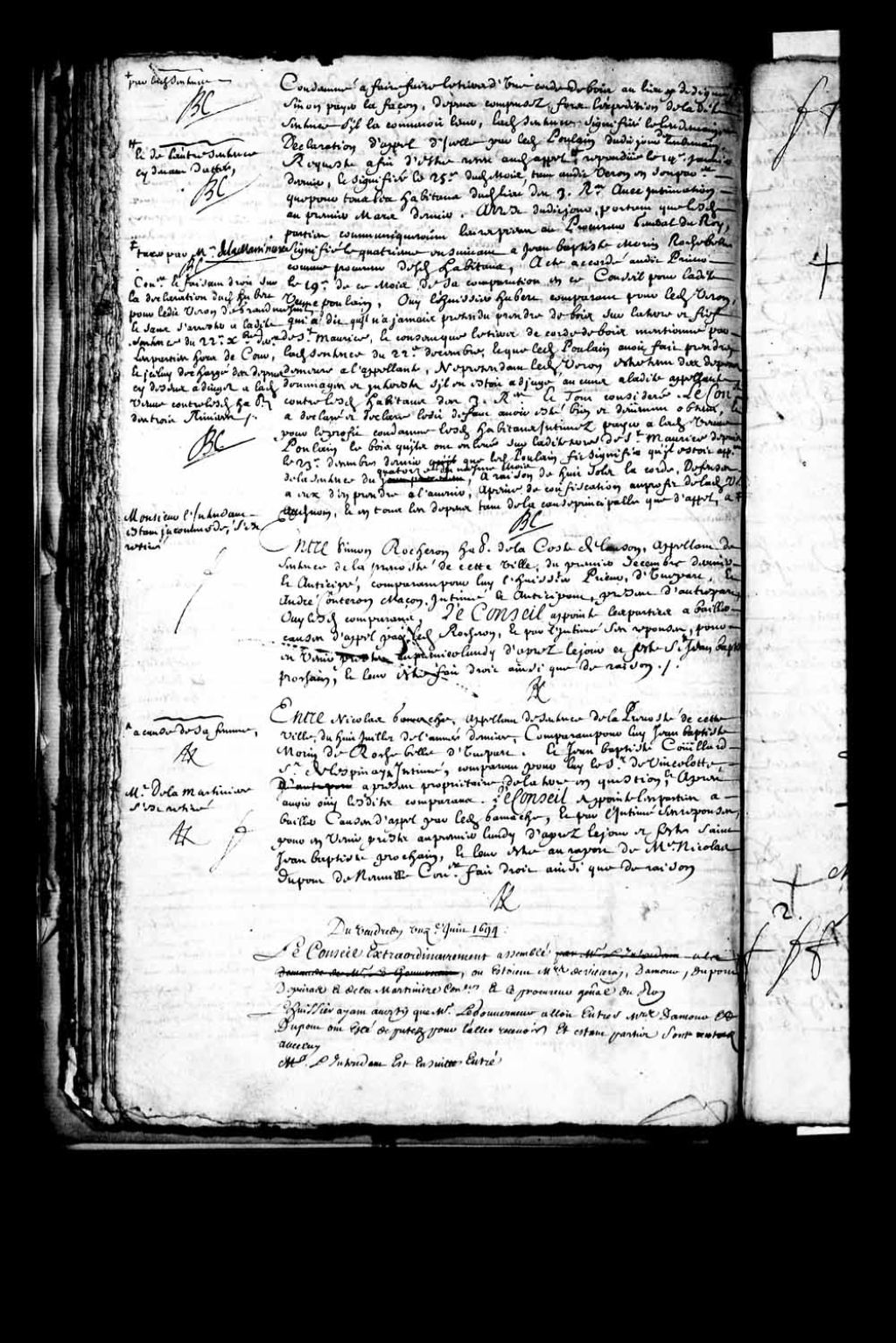 Transcription du texte avec orthographe modernisée : «Monsieur de la Martinière s'est retiré. Entre Nicolas GAMACHE, appelant de sentence de la prévôté de cette ville du huit juillet de l'année dernière, comparant pour lui Jean-Baptiste Morin de Rochebelle d'une part, et Jean-Baptiste COUILLARD sieur de L'ESPINAY à cause de sa femme, intimé comparant pour lui le sieur de Vincelotte, à présent propriétaire de la terre en question, et après avoir ouï lesdits comparants, le Conseil appointe les parties à bailler causes d'appel par ledit Gamache, et par l'intimé ses réponses, pour en venir prêts au premier lundi d'après le jour et fête Saint-Jean-Baptiste prochain, et leur être au rapport de maître Nicolas Dupont de Neuville conseiller fait droit ainsi que de raison. ROUER DE VILLERAY.»
