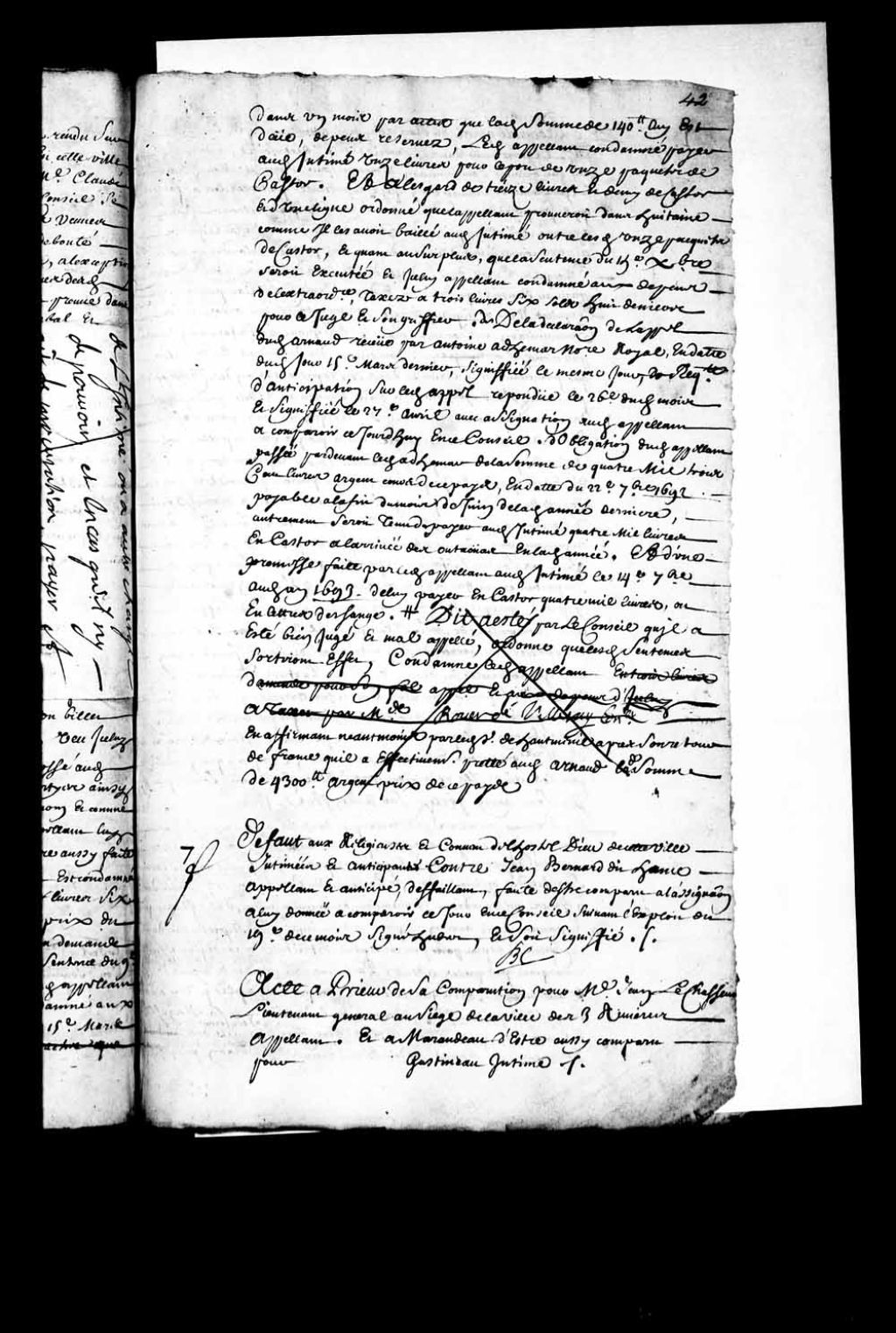 Transcription du texte avec orthographe modernisée : «Acte à Prieur de sa comparution pour maître Jean LeChasseur lieutenant général au siège de la ville des Trois-Rivières appelant et à Marandeau d'être aussi comparu pour Gatineau intimé. BOCHART CHAMPIGNY.»