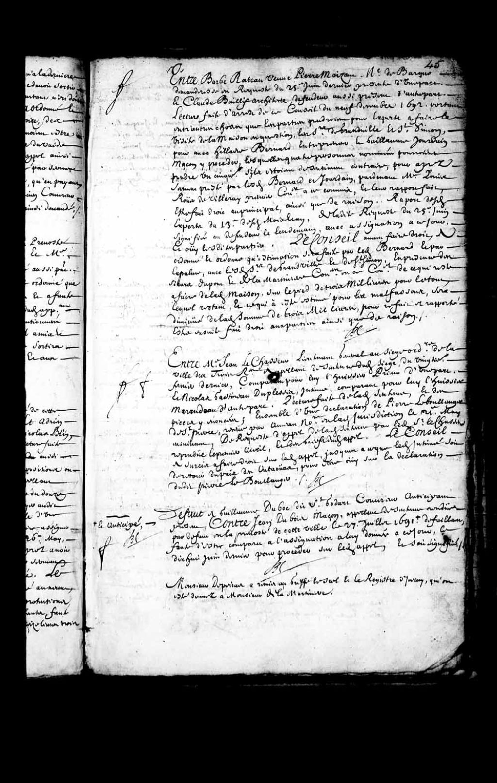 - Transcription du texte avec orthographe modernisée : «Entre Barbe RATEAU veuve Pierre Moisan maître de barque demanderesse en requête du vingt-cinq juin dernier présente d'une part et Claude Bailly architecte défendeur aussi présent d'autre part, lecture faite d'arrêt de ce Conseil du neuvième décembre 1692 portant entre autres choses que les parties prendraient pour experts, à faire la visite de la maison en question, les sieurs de Grandville (Granville) et Saint-Simon, pour avec Hilaire Bernard entrepreneur et Guillaume Jourdain maçon y procéder, lesquelles quatre personnes nommées pourraient prendre un cinquième s'ils étaient de sentiment contraire, pour après serment prêté par ledit Bernard et Jourdain, par-devant maître Louis Rouer de Villeray premier conseiller à ce commis, et leur rapport fait, être fait droit au principal ainsi que de raison, rapport desdits experts du 13 desdits mois et an, de ladite requête du vingt-cinquième juin, signifiée au défendeur le lendemain avec assignation à ce jour, et ouï lesdites parties. Le Conseil avant faire droit, a ordonné et ordonne qu'estimation sera faite par ledit Bernard et par Lapalme avec les sieurs de Grandville et de Saint-Simon en présence des sieurs Dupont et de la Martinière conseillers en ce Conseil, de ce qui reste à faire de ladite maison, sur le pied de trois mille livres pour le tout, lequel restant, et ce qui a été estimé pour les malfaçons, sera diminué de ladite somme de trois mille livres, pour ce fait et rapporté, être, ensuite fait droit aux parties ainsi que de raison. BOCHART CHAMPIGNY.»