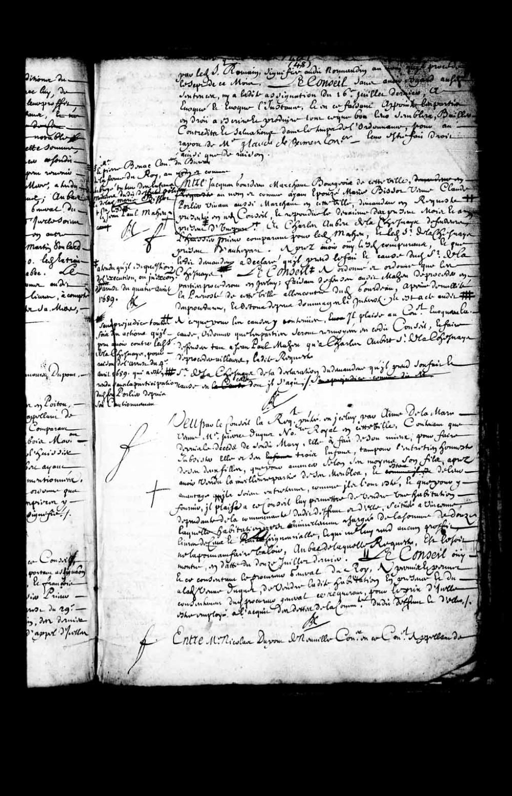 - Transcription du texte avec orthographe modernisée : «Entre maître Nicolas DUPONT de NEUVILLE conseiller en ce Conseil appelant de sentence rendue par défaut en la prévôté de cette ville le dix-huit mai dernier, et anticipé, présent d'une part, et Guillaume Duboc dit Saint-Godart (Saint-Godard) couvreur, intimé et anticipant aussi présent d'autre part, lecture faite d'arrêt du cinq juillet dernier, portant entre autres choses que Hilaire Bernard de la Rivière (Larivière) architecte juré arpenteur toiseur et mesureur ferait la réduction a toise des pureaux, ou échantillons qui ne sont pas comme ils devraient être, et en dresserait son rapport, même du vide des lucarnes, et du rapport dudit Bernard en date du vingt-quatre juillet dernier, et ouï lesdites parties, le Conseil a mis et met l'appellation et ce dont était appelé au néant, émendant et suivant ledit rapport, ordonné que l'intimé passera à compte audit appelant, sur ce qu'il a reçu de lui, la somme de trente-cinq livres neuf sols quatre deniers pour vingt-cinq toises douze pieds, à vingt-huit sols la toise de bardeau, appliqué par ledit intimé sur l'une des deux maisons appartenant audit appelant à la basse-ville rue Saint-Pierre, et à l'égard de planches que ledit intimé a appliquées aux pignons de ladite maison, les parties se rapporteront à Mesnage et Callier charpentiers, que ledit Conseil commet pour priser ce qui appartient audit intimé, pour son travail, et ce fait les parties compteront par-devant maître Bermen de la Martinière conseiller sauf audit appelant son action contre Pierre Gatien couvreur, si faire ce doit, dépens compensés, à la réserve de ceux de ladite sentence rendue par défaut, qui seront payés par ledit appelant. BOCHART CHAMPIGNY.»