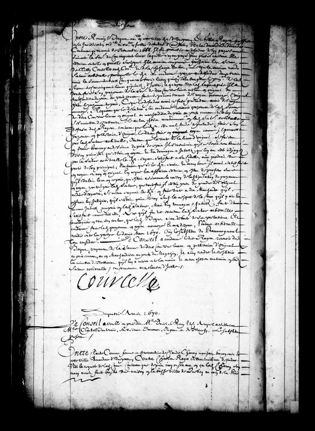 Transcription du texte avec orthographe modernisée : «Du quatrième août 1670. Le Conseil assemblé où présidait messire Daniel de Rémy etc, auquel assistaient messire Claude Bouteroue, Messieurs Damours, Dupont et DeMouchy, le substitut présent. Entre Claude CAMUS femme et procuratrice de Claude Charon marchand bourgeois de cette ville demandeur d'une part contre Charles ROGER DESCOULOMBIERS défendeur; vu la requête de ladite Camus contenant que depuis cinq ou six ans en ça ledit Charon son mari aurait fait bâtir une maison en la basse-ville de Québec au coin de la rue Notre-Dame, la place qu'ils possédaient lors étant trop petite pour leur dessein, ils auraient acheté de Toussaint Toupin un morceau de terre attenant de treize pieds de front sur ladite rue et de quarante et un de profondeur, par contrat du seizième avril mille six cent soixante, qu'ils n'auraient pas faits faire ladite maison de quarante et un pieds de profondeur afin de laisser par derrière quelque petite place vide tant pour la commodité du public à cause d'une petite rue qui descend de la haute-ville entre sa dite maison et celle de Charles Roger, que pour la conservation de sa dite maison, que ledit Roger s'était avisé depuis peu de faire changer ledit chemin pour faire une petite cour et le rejeter entièrement sur ladite place laissée; et attendu que ce travail leur faisait un notable préjudice, il lui fut fait défenses de passer outre; ordonnance au bas de ladite requête permettant de le faire assigner, et cependant défense; ouï ledit Roger sur ladite requête; vu le contrat de concession faite audit Toupin du quinze juin mille six cent cinquante-cinq d'une place sur ladite rue Notre-Dame de quarante pieds de front sur quarante et un de profondeur; contrat de vente faite par ledit Toupin audit Charon de treize pieds de front sur ladite profondeur, lesdits treize pieds faisant partie de ladite concession, le contrat en date du seizième avril mille six cent soixante; opposition formée au bâtiment dudit Charon pour la conservation dudit petit chemin du dix-neuf juin mille six cent cinquante-sept; requête sur ladite opposition; consentement du procureur et receveur de Messieurs de la compagnie de la Nouvelle-France; arrêt du Conseil du treize septembre mille six cent soixante-quatre rendu entre lesdits Charon et Roger, par lequel aurait été ordonné que ledit Charon pouvait bâtir sur son ancienne place et s'avancer sur ledit petit chemin en le laissant par lui large de cinq pieds de roi au droit de l'ancienne maison dudit Roger et lui par le bout d'en bas, et l'entretenant ainsi qu'il y était obligé par le titre de sa concession; titre de concession faite le quinze octobre mille six cent cinquante-huit à Pierre Naulin dit LaFougère aux droits duquel est ledit Roger d'un emplacement de trente pieds de long sur la largeur qui se trouverait depuis la rue jusqu'au pied du coteau; conclusions du substitut du procureur général; ouï le rapport de messire Claude Bouteroue, conseiller du Roi en ses Conseils, intendant de la justice, police et finances en la Nouvelle-France. Après que ledit conseiller s'est transporté sur les lieux pour connaître le sujet de la contestation; le Conseil a ordonné et ordonne que la clôture commencée par ledit Descoulombiers sera retirée sur lui, en sorte qu'elle coupe le carré de sa prétendue Cour, en travers sur toute la longueur à prendre depuis l'encoignure d'en bas de sa maison jusqu'à celle d'en haut, à laquelle clôture il pourra faire une porte pour entrer de la rue dans ladite petite Cour, l'a condamné et condamne à faire incessamment rétablir l'ouverture par lui faite en sorte que le chemin soit libre et facile pour monter et descendre, lequel demeurera de toute la largeur qui se trouvera depuis ladite clôture retirée jusqu'à la maison dudit Charon. COURCELLE BOUTROUE.»