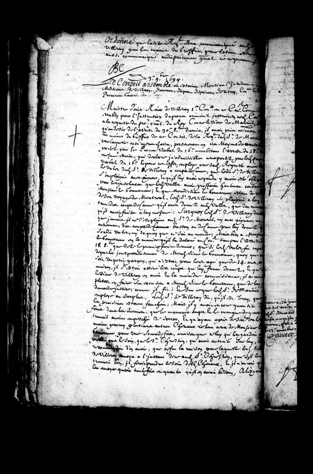 Transcription du texte avec orthographe modernisée : «Du 3e novembre 1694. Le Conseil assemblé où étaient Monsieur l'intendant, Messieurs de Villeray, Damours, Dupont, Depeiras, de Vitray conseillers et le procureur général du Roi. Maître Louis ROUER DE VILLERAY premier conseiller en ce Conseil commissaire établi pour l'instruction du procès criminel instruit en ce dit Conseil à la requête du procureur général du Roi, contre le sieur de Mareuil, a dit qu'au désir de l'arrêt du trentième octobre dernier, il avait pris communication par les mains du greffier de ce Conseil de la requête dudit sieur de Mareuil, par laquelle entre autres choses persévérant, en ses moyens de récusation portés par le procès verbal du seizième, nonobstant l'arrêt du dix-huit du même mois, qui déclare inadmissibles ceux portés par ledit procès verbal du 16e et pour cet effet employe par sa dite requête avoir battu le valet du sieur de Villeray a coups de Canne; que ledit sieur de Villeray s'en plaignit avec aigreur, et qu'il lui aurait répondu y avoir été obligé, par les insolences que ledit valet aurait proférées hautement contre Monsieur le gouverneur, et que mondit sieur le gouverneur étant de retour de son voyage de Montréal, ledit sieur de Villeray se plaignit à lui tant des coups de Canne qu'il avait donnés audit valet, que des menaces qu'il avait faites à lui-même; sur quoi ledit sieur de Villeray déclare que jamais il ne s'est plaint audit sieur de Mareuil ni avec aigreur, ni autrement, des coups de bâton, ou de Canne, par lui donnés à sondit valet, ni de quoi que se soit au monde; mais bien à Monsieur le gouverneur, de la manière qu'il la déclaré au Conseil, tant par l'arrêt du dix-huit octobre, que dès le premier février dernier, que si ledit valet fut capable de parler irrespectueusement de mondit sieur le gouverneur, quoi que ce soit un petit garçon qui n'était pour lors âgé que de quatorze ans ou environ, il s'était attiré les coups qui lui furent donnés, et que si le sieur de Villeray en avait eu la moindre connaissance, il aurait plutôt été en faire ses excuses à mondit sieur le gouverneur, que de lui en demander justice comme il fit, et sur ce que ledit sieur de Mareuil employe au surplus, ledit sieur de Villeray, dit qu'il est vrai que les prairies étaient fauchées; mais il y avait encore quantité de foins dans les siennes, que le mauvais temps et le manque de gens de travail avaient empêché de serrer, et qu'ayant appris de ses valets, accouru parmi plusieurs autres chevaux retenu ceux de mondit le gouverneur pour une seconde fois, à raison que celui qui les gardait n'en prenait pas le soin, que le sieur Chrétien, qui avait autorité sur lui, lui recommandait d'en avoir, que ce fût la raison pour laquelle ledit sieur de Villeray envoya à l'instant dire audit sieur Chrétien que s'il le trouvait bon, il ferait prendre le soin des chevaux, et il n'aurait qu'à les envoyer quérir toutes fois et quantes qu'il en aurait besoin, à l'égard de quoi ledit sieur de Villeray n'en rend ici raison sinon pour marquer son respect envers Monsieur le gouverneur, se rapportant au surplus aux premières déclarations par lui faites, et qui sont portées pour l'arrêt du dix-huitième octobre, dont lecture a été faite audit sieur de Mareuil, le lendemain dix-neuf suivant le procès verbal dudit sieur de Villeray et le rapport qu'il en fit au Conseil ledit jour 30e et ledit sieur de Villeray retiré, ouï sur ce le procureur général du Roi: le Conseil du consentement dudit procureur général, a ordonné et ordonne que les déclarations ce jourd'hui faites par ledit sieur de Villeray seront communiquées audit sieur de Mareuil. BOCHART CHAMPIGNY.»