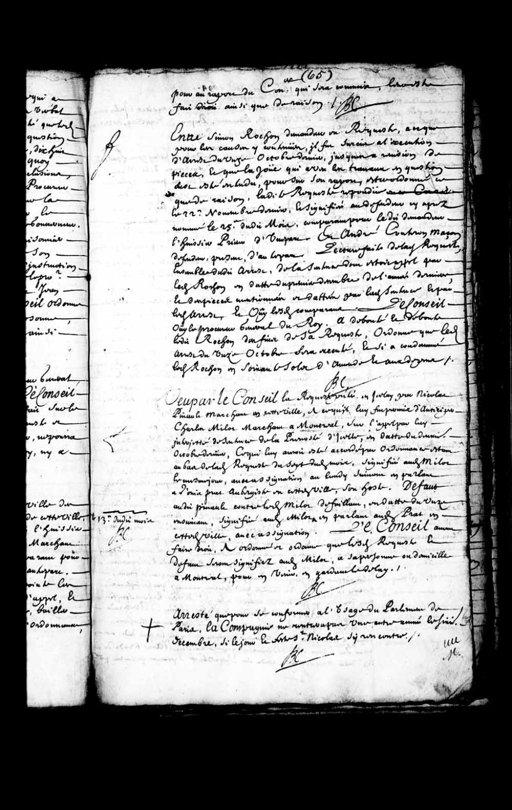 Arrêt que pour se conformer à l'usage du Parlement de Paris, à l'effet que la Compagnie ne rentrera pas une autre année le 6 décembre, si le jour et la fête de Saint-Nicolas s'y rencontrent, 6 décembre 1694, Archives nationales à Québec, Fonds Conseil souverain, (03Q,TP1,S28,P7065).