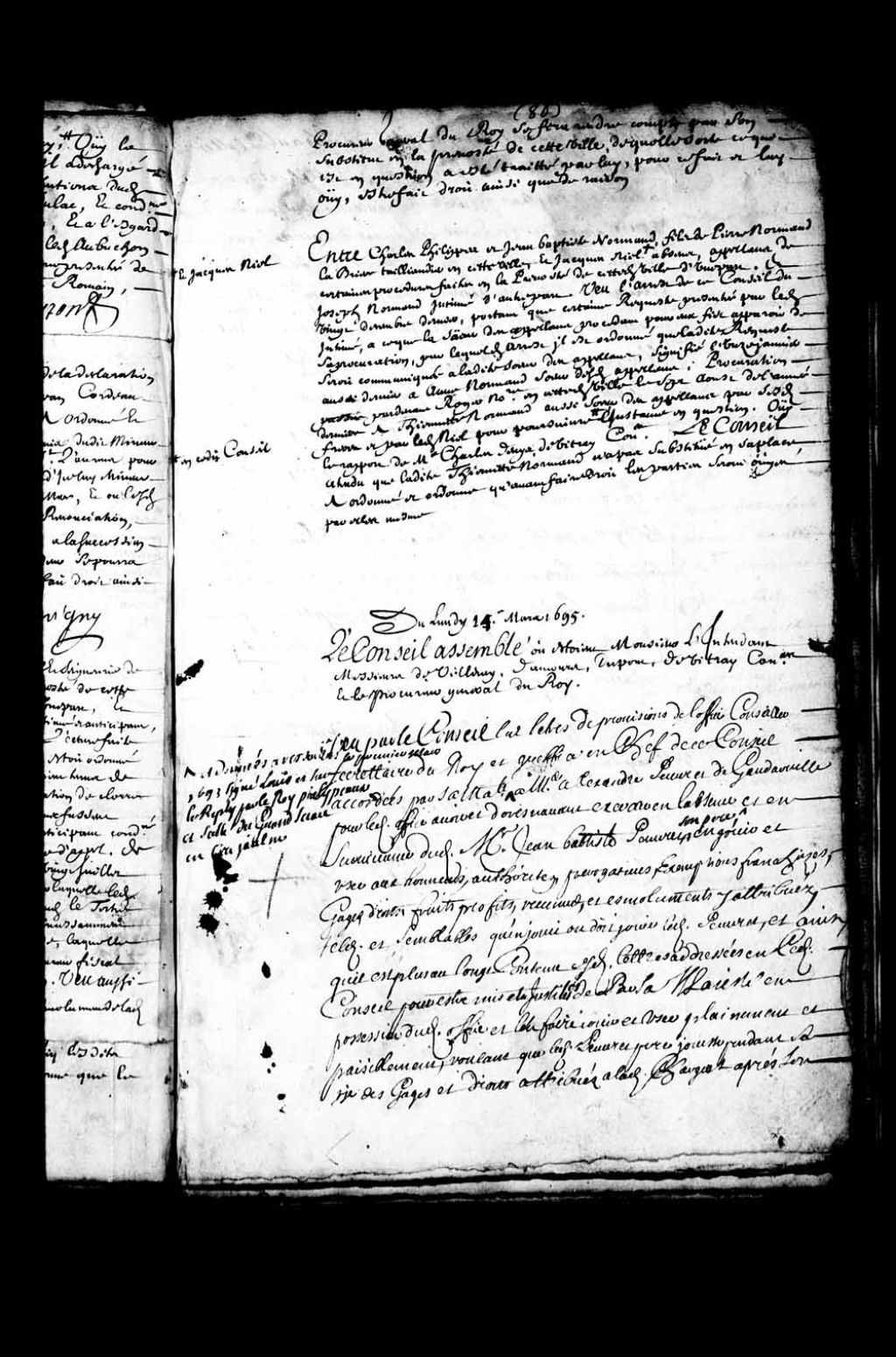- Transcription du texte avec orthographe modernisée : «Du lundi quatorze mars mille six cent quatre-vingt-quinze. Le Conseil assemblé où étaient Monsieur l'intendant Maîtres Louis Rouer de Villeray premier conseiller. Mathieu Damours, Dechaufour. Nicolas Dupont de Neuville. Charles Denys de Vitray conseiller. Et le procureur général du Roi. Vu par le Conseil les lettres de provisions de l'office du conseiller secrétaire du Roi et greffier en chef de ce Conseil accordées par sa Majesté, et données à Versailles le premier mars mille six cent quatre-vingt-treize signées Louis, et sur le repli par le Roi Phelypeaux et scellées du grand sceau en cire jaune, à Monsieur Alexandre Peuvret de Gaudarville, par ledit office avoir et Dorénavant exercer en l'absence et survivance dudit Monsieur Jean-Baptiste Peuvret son père, en jouir et user aux honneurs, autorités, prérogatives, exemptions franchises, gages, droits, fruits, profits, revenus et [...]