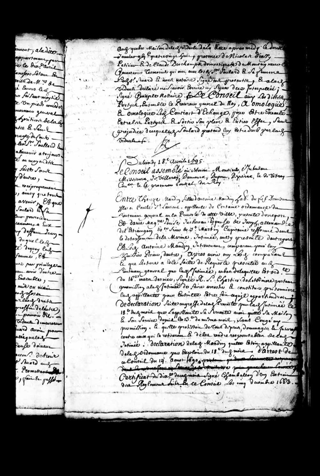 - Transcription du texte avec orthographe modernisée : «Du lundi dix-huit avril mille six cent quatre-vingt-quinze. Le Conseil assemblé où étaient Monsieur l'intendant Maîtres Louis Rouer de Villeray premier conseiller. Mathieu D'Amours Deschaufour. Nicolas Dupont de Neuville. Jean-Baptiste Depeiras. Et Charles Denys de Vitray conseillers. Et le procureur général du Roi. Entre Thérèse MANDIN fille de Antoine Mandin habitant du fief de Mesnu île et comté Saint-Laurent, appelante de certaine ordonnance du lieutenant général en la prévôté de cette ville, présente d'une part, et dame Madeleine Louise JUCHEREAU épouse de Joseph, Alexandre de Lestraingan écuyer sieur de Saint-Martin, capitaine reformé dans le détachement de la marine, intimée, aussi présente d'autre part, et ledit Antoine MANDIN intervenant, comparant pour lui l'huissier Prieur, d'autre, après avoir ouï lesdits comparants, et que lecture a été faite de requête présentée audit lieutenant général par ladite intimée, au bas de laquelle est ordonnance du seizième mars dernier, signée R. L. Chartier de Lotbinière, portant permission à ladite intimée de faire arrêter et constituer prisonnière ladite appelante pour ensuite être fait ce qu'il appartiendrait; de déclaration faite au greffe de ladite prévôté par ladite intimé le dix-huit dudit mois que l'appelante sa servante avait quitté sa maison et son service depuis le treizième du même mois, sans congé ni permission, et qu'elle protestait de tous dépens dommages et intérêts contre ceux qui la retireront et de les rendre responsables de ladite intimée. Déclaration de ladite Mandin qu'elle était appelante de ladite ordonnance par exploit du dix-huit dudit mois: d'arrêt de ce conseil du quatorzième août mille six cent quatre-vingt-dix. certificat du dix de ce dit mois signé Chamballon; d'un extrait des règlement faits en ce Conseil les cinq décembre mille six cent soixante-trois et deux juin mille six cent soixante-treize et en l'année mille six cent soixante-seize au sujet des engagés qui délaissent le service de leurs maîtres, d'ordre de Monsieur l'intendant dudit jour dix-huit mars que l'appelante demeurerait chez la femme du sieur Gourdeau jusqu'à ce que ledit lieutenant général en ait ordonné autrement par sentence, ayant renvoyé les parties à la justice ordinaire, de requête sur laquelle l'appel aurait été tenu pour bien relevé par ordonnance du vingt ensuivant de requête d'intervention du père de ladite appelante, répondue le vingt-huit ensuivant, signifiée le deuxième de ce présent mois à ladite intimée; du plaidoyé de ladite intimée du onzième de ce mois. D'arrêt de ce dit Conseil du même jour, portant que les pièces mises sur le bureau seraient communiquées à maître Charles Denys de Vitray conseiller faisant en cette partie fonction de procureur général du Roi, par les mains duquel les parties prendraient communication des dires les unes des autres, pour y répliquer si bon leur semble, signifiée le quinze à ladite intimée avec assignation à ce jour, ouï ledit sieur de Vitray. Le Conseil sans s'arrêter à ladite ordonnance dont est appel a ordonné et ordonne que l'appelante sera renvoyée audit Mandin intervenant, pour en être par lui disposé ainsi qu'il avisera, et l'intimée condamnée aux dépens, à taxer par maître Mathieu Damours conseiller. BOCHART CHAMPIGNY.»