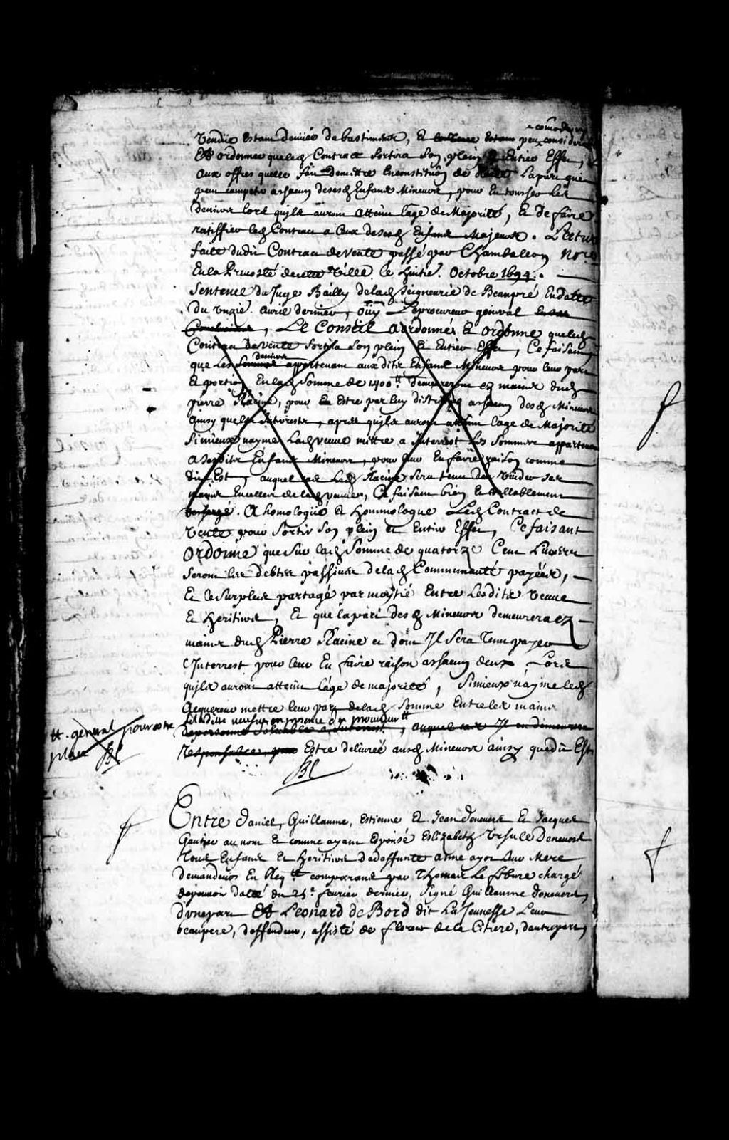 - Transcription du texte avec orthographe modernisée : «Entre Daniel, Guillaume, Etienne et Jean DENEVERS, et Jacques GAUTIER au nom et comme ayant épousé Ursule de nevers, tous enfants et héritiers de défunte Anne Ayot leur mère, demandeurs en requête, comparant par Thomas Lefebvre chargé de pouvoir daté du 25e février dernier, signé Guillaume de nevers, d'une part et Léonard DEBORD dit LAJEUNESSE leur beau-père, défendeur, assisté de Florent de Lacitière d'autre part. Parties ouïes, le Conseil avant faire droit a ordonné et ordonne que la terre du Platton Sainte-Croix à eux appartenant, sera ensemencée par ledit Gautier, auquel sera tenu compte des labours et autres travaux qu'il fera à cet effet sur icelle suivant l'usage ordinaire, et que cependant lesdites parties se communiqueront sous leurs récépissés toutes les pièces dont elles entendent se servir pour éviter à frais, et en venir au lundi d'après le jour et fête de Saint-Jean-Baptiste prochain, auquel jour sera fait droit sur ce qui se trouvera d'écrit et produit, au rapport de maître Louis Rouer de Villeray premier conseiller ainsi que de raison. BOCHART CHAMPIGNY.»