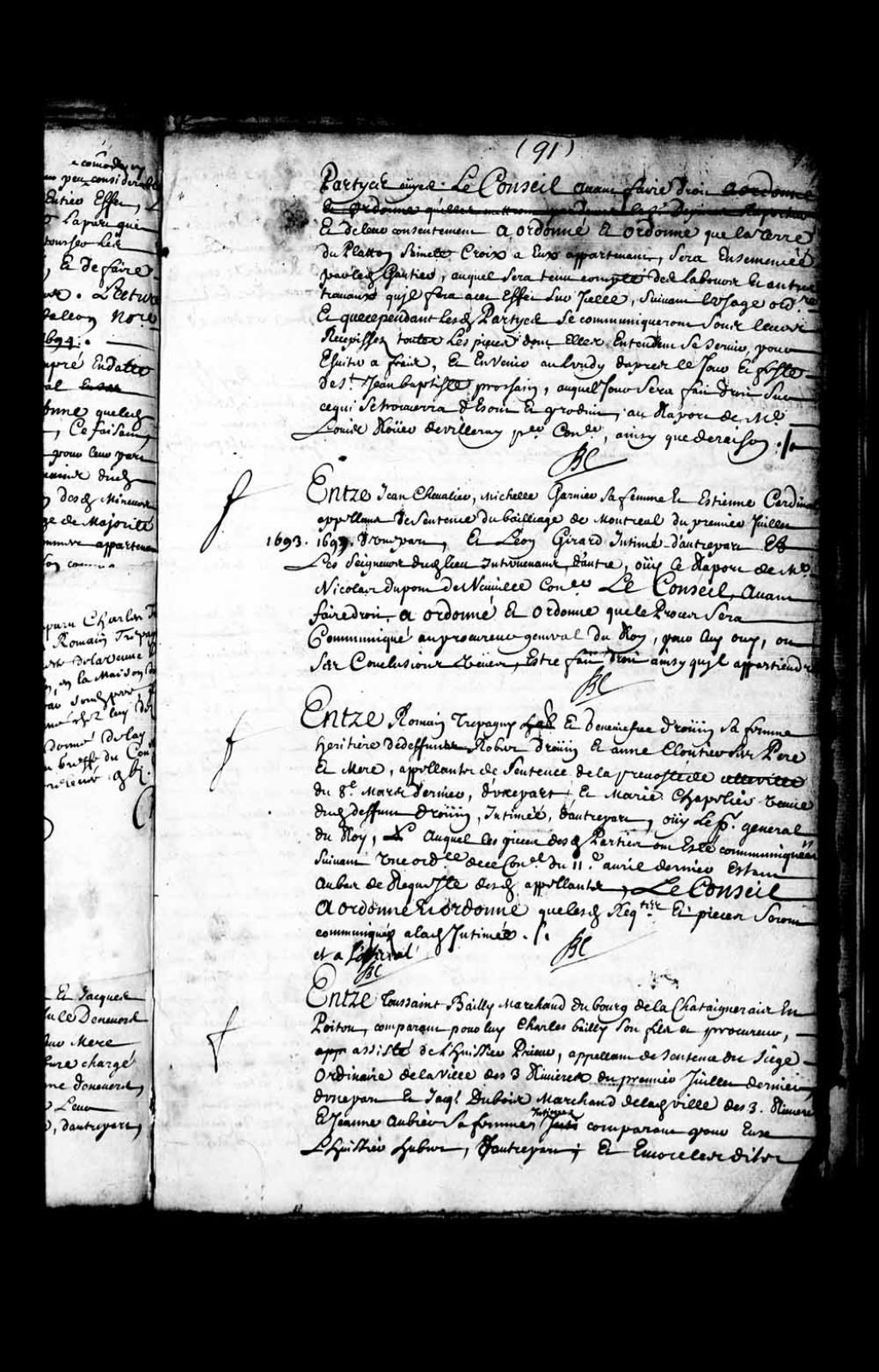 Transcription du texte avec orthographe modernisée : «Entre Jean CHEVALIER Michelle GARNIER sa femme et Etienne CARDINAL appelant de sentence du bailliage de Montréal du premier juillet 1693. D'une part, et Léon GIRARD intimé d'autre; et les seigneurs dudit lieu intervenant, d'autre; ouï le rapport de maître Nicolas Dupont de Neuville conseiller. Le Conseil avant faire droit a ordonné et ordonne que le procès sera communiqué au procureur général du Roi, pour lui ouï, ou ses conclusions vues être fait droit ainsi qu'il appartiendra. BOCHART CHAMPIGNY.»