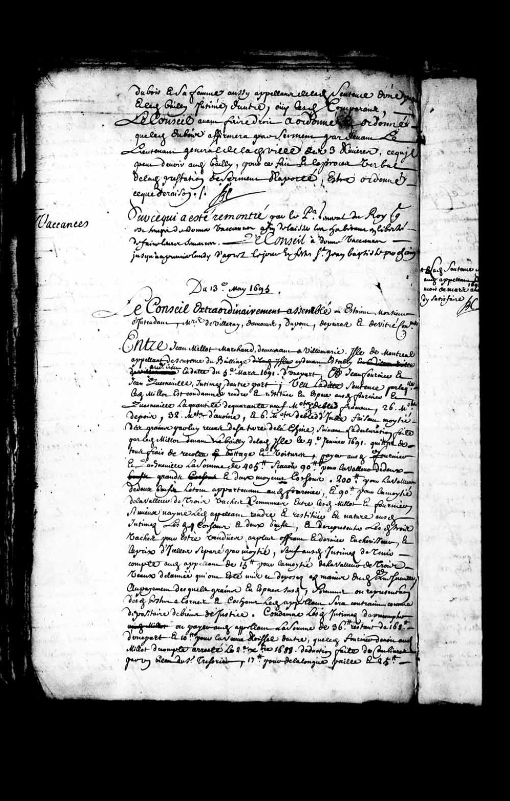 Transcription du texte avec orthographe modernisée : «Du treizième mai mille six cent quatre-vingt-quinze. Le Conseil assemblé extraordinairement où étaient Monsieur l'intendant, maîtres Louis Rouer de Villeray premier conseiller, Mathieu Damours Dechaufour, Nicolas Dupont de Neuville, Jean-Baptiste Depeiras, et Charles Denys de Vitré conseillers. Entre Jean MILLOT marchand demeurant à Ville-Marie, île de Montréal appelant de sentence du bailliage ci-devant établi audit lieu, en date du cinquième mars 1691, d'une part, et Jean FOURNIER et Jean QUESNEVILLE intimés d'autre part, vu ladite sentence par laquelle ledit Millot est condamné rendre et restituer en espèces auxdits Fournier et Quesneville la quantité de quarante-neuf minots de blé froment, vingt-six minots de pois, trente-deux minots d'avoine et six minots de blé d'inde faisant moitié des grains par lui reçus de sa terre de Lachine suivant la déclaration faite par ledit Millot [...]
