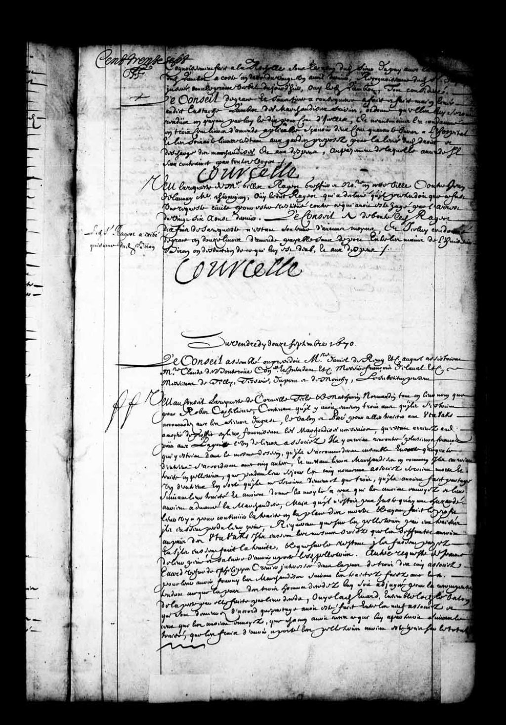 - Transcription du texte avec orthographe modernisée : «Du vendredi douze septembre 1670. Le Conseil assemblé où présidait messire Daniel de Rémy etc auquel assistaient messire Claude de Bouteroue conseiller et intendant etc. messire François de Laval etc. messieurs de Tilly, Tesserie, Dupont et Demouchy, le substitut présent. Vu au Conseil la requête de Corneille Thècle et Mathurin Normandin tant en leur nom que pour Robert Cachelieure, contenant qu'il y avait environ trois ans qu'ils s'étaient accommodés avec les sieurs Dugast, le Valon et Peré pour aller traiter aux Outaouaks à moitié de profit en leur fournissant les marchandises nécessaires; qu'étant arrivés audit pays avec Lappointe l'un de leurs associés ils y auraient rencontre plusieurs François qui y étaient dans le même dessein, qu'ils s'accommodèrent ensemble en sorte que quatre d'entre eux s'accordèrent avec cinq autres, et mettant leurs marchandises en commun ils auraient [...]