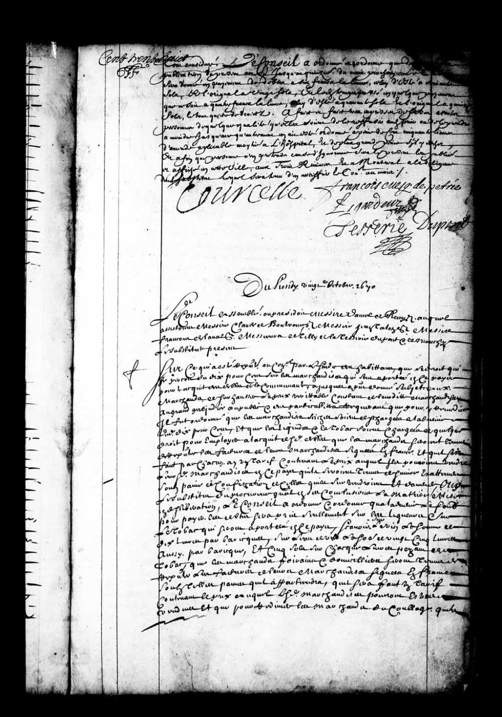 - Transcription du texte avec orthographe modernisée : «Du lundi vingtième octobre 1670. Le Conseil assemblé où présidait messire Daniel de Rémy etc, auquel assistaient messire Claude Bouteroue etc, messire Jean Talon etc, messire François de Laval etc, Messieurs de Tilly de la Tesserie, Dupont et de Mouchy, le substitut présent. Sur ce qui a été représenté au Conseil par le syndic des habitants, que le droit qui se perçoit du dix pour-cent sur les marchandises qui sont apportées en ce pays pour l'acquit des dettes de la communauté, a jusqu'à présent donné sujet aux marchands de surhausser le prix véritable coûtant de leursdites marchandises au grand préjudice du public et des particuliers, requérant que pour y remédier il fut ordonné que les marchandises sèches soient déchargées à l'avenir dudit dix pour-cent, et que les liquides et le tabac soient chargées de quelque droit pour employer à l'acquit desdites dettes que les marchands [...]
