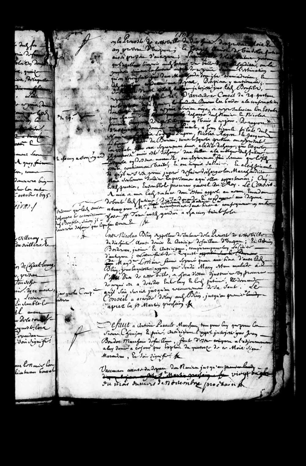 Délai accordé à Nicolas Blain jusqu'au premier jour que rentrera la Compagnie après la Saint-Martin dans la cause l'opposant à Adrien Bourdezeau, sieur de LaBorde, 31 octobre 1695, Archives nationales à Québec, Fonds Conseil souverain, (03Q,TP1,S28,P7173).