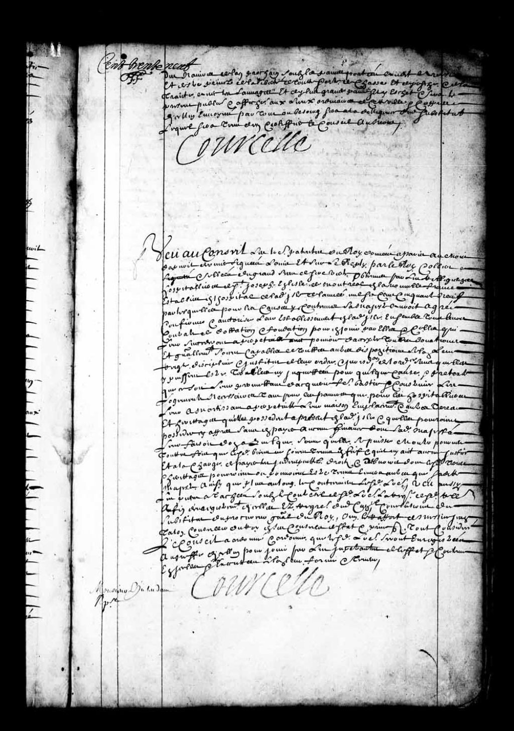- Transcription du texte avec orthographe modernisée : «Vu au Conseil les lettres patentes du Roi, données à Paris au mois d'avril dernier signées Louis et sur le repli, par le Roi, Colbert et scellées du grand sceau de cire verte, obtenues par les religieuses hospitalières de Saint-Joseph, église de Montréal de la Nouvelle-France, établies en l'hôpital de ladite île, de l'année mille six cent cinquante-neuf, par lesquelles pour les causes y contenues sa Majesté aurait agréé, confirmé et autorisé leur établissement en ladite île, ensemble tous leurs contrats de dotation et fondation pour en jouir par elles et celles qui leur succéderont a perpétuité avec pouvoir d'accepter toutes donations et généralement soient capables de toutes autres dispositions selon leur règle, discipline et institut de leur ordre, et juridiction de l'ordonnance sans qu'elles y puissent être troublées ni inquiétées pour quelque cause et prétexte que ce soit, leur permettant d'acquérir faire bâtir et construire les logements nécessaires tant pour les pauvres que pour les hospitalières, leur amortissant a perpétuité leur maison, emplacement et autres terres et héritages qu'elles possèdent à présent en ladite îles et qu'elles pourraient posséder ci-après sans en payer aucune finance, dont sa dite Majesté leur faisait don a quelque somme qu'elle se puisse monter pourvu toutefois que lesdits biens ne soient tenus en fief et qu'il n'y ait aucune justice, et à la charge de payer les indemnités, droits et devoirs dont lesdites terres et héritages pourraient ou pouvaient être tenus envers autres que sa dite Majesté, ainsi que plus au long le contiennent lesdites lettres; vu aussi les pièces attachées sous le contre-sceau desdites lettres, la requête desdites religieuses afin d'enregistrement d'icelles aux registres dudit Conseil; conclusions du substitut du procureur général du Roi; ouï le rapport de messire Jean Talon, conseiller du Roi en ses Conseils d'état et privé etc. Tout considéré, le Conseil a ordonné et ordonne que lesdites lettres seront enregistrées au greffe d'icelui pour jouir par les impétrantes de l'effet et contenu en icelles, et exécutées selon leur forme et teneur. Monsieur l'intendant rapporteur. COURCELLE.»