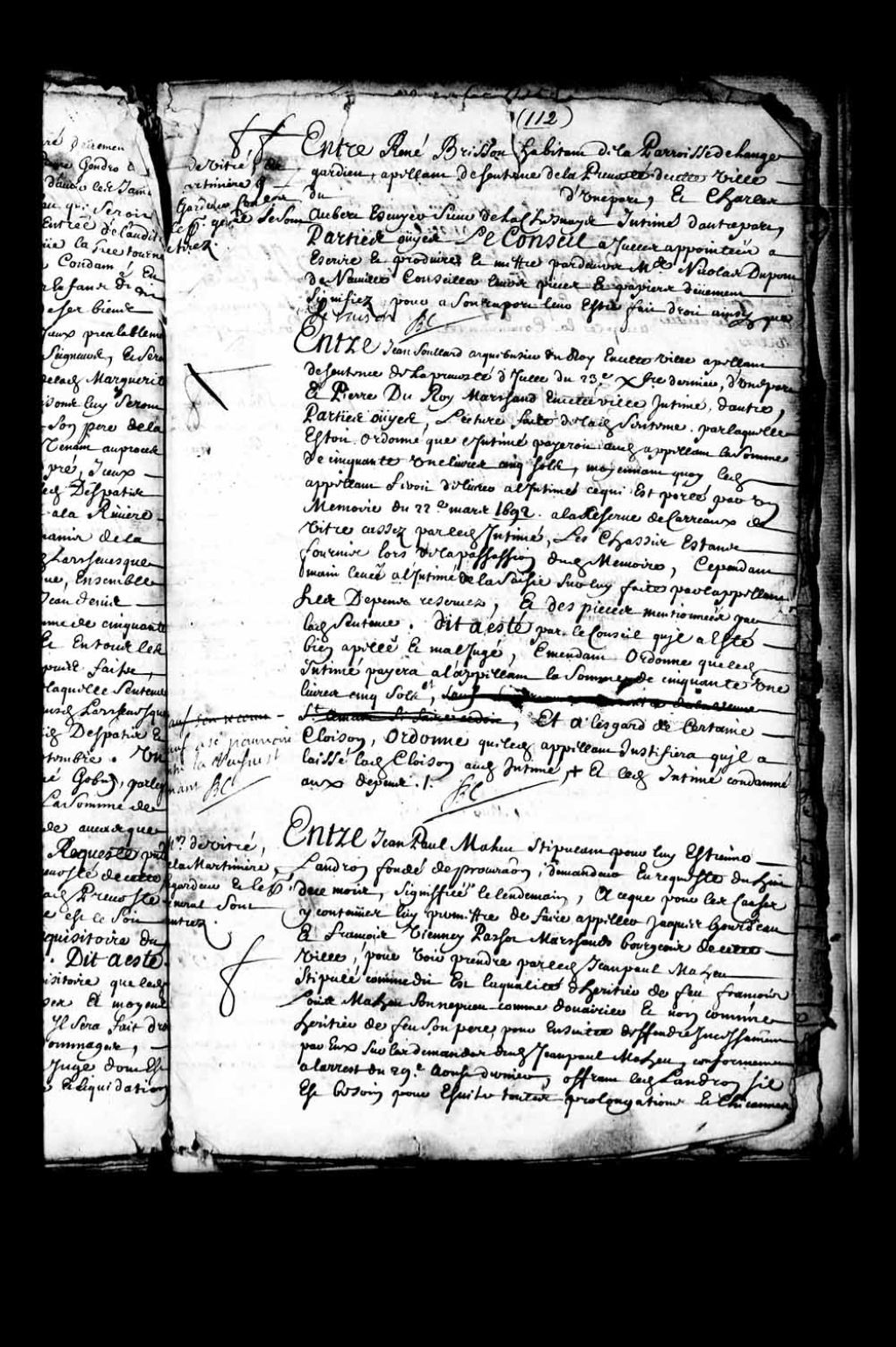 - Transcription du texte avec orthographe modernisée : «Lesdits sieurs ci-dessus qui s'étaient retirés sont rentrés. Entre Jean-Paul MAHEU stipulant pour lui Etienne Landron fondé de procuration, demandeur en requête du huitième de ce mois, signifiée le lendemain, à ce que pour les causes contenues lui permettre de faire appeler Jacques Gourdeau et François Vienney Pachot marchands bourgeois de cette ville pour voir prendre par ledit Jean-Paul Maheu stipulé comme dit est la qualité d'héritier de feu François Louis Maheu son neveu comme douairier et non comme héritier de feu son père, pour ensuite défendre incessamment par eux sur les demandes dudit Jean-Paul Maheu conformément à l'arrêt du vingt-neuf août dernier, offrant ledit Landron s'il est besoin pour éviter toutes prolongations et chicanes qui pourraient être faites comme ci-devant, de fournir caution jusqu'au retour dudit Jean-Paul Maheu, d'une part, et lesdits Pachot comparant pour lui l'huissier Hubert et Gourdeau comparant pour l'huissier Prieur d'autre part, ouï lesdits comparants, le Conseil avant faite droit a ordonné et ordonne qu'à la diligence dudit Landron il sera procédé dans huitaine en la prévôté de cette ville à l'élection d'un tuteur aux enfants mineurs de Claude Porlier et que ledit Gourdeau justifiera si sa femme a accepté la communauté dudit défunt Claude Porlier. BOCHART CHAMPIGNY.»