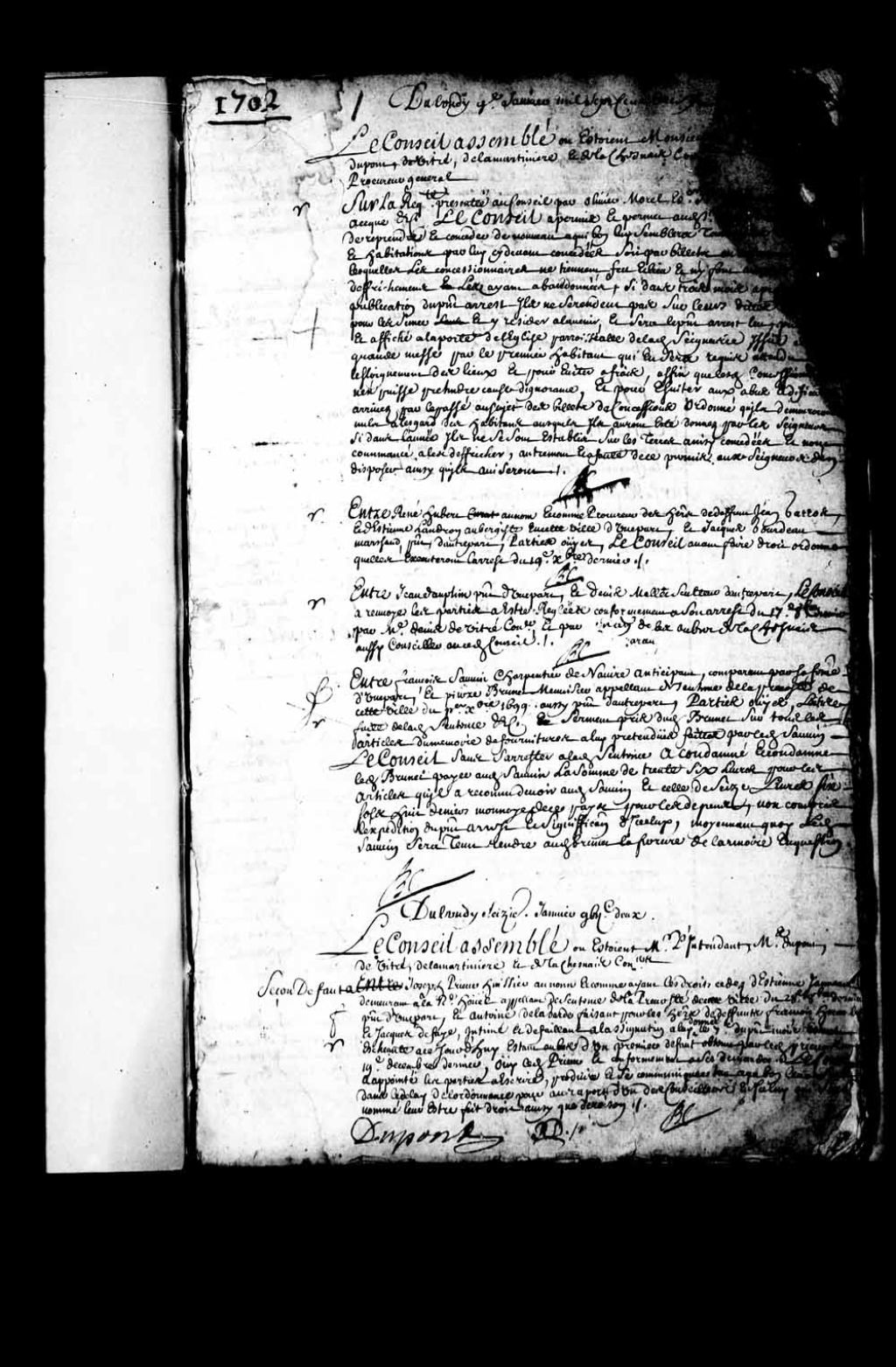 Renvoi des parties, Jean Dauphin contre Denis Mallet (Malet), sculpteur, de l'arrêt du Conseil du 17 octobre 1701, 9 janvier 1702, Archives nationales à Québec, Fonds Conseil souverain, (03Q,TP1,S28,P7207).