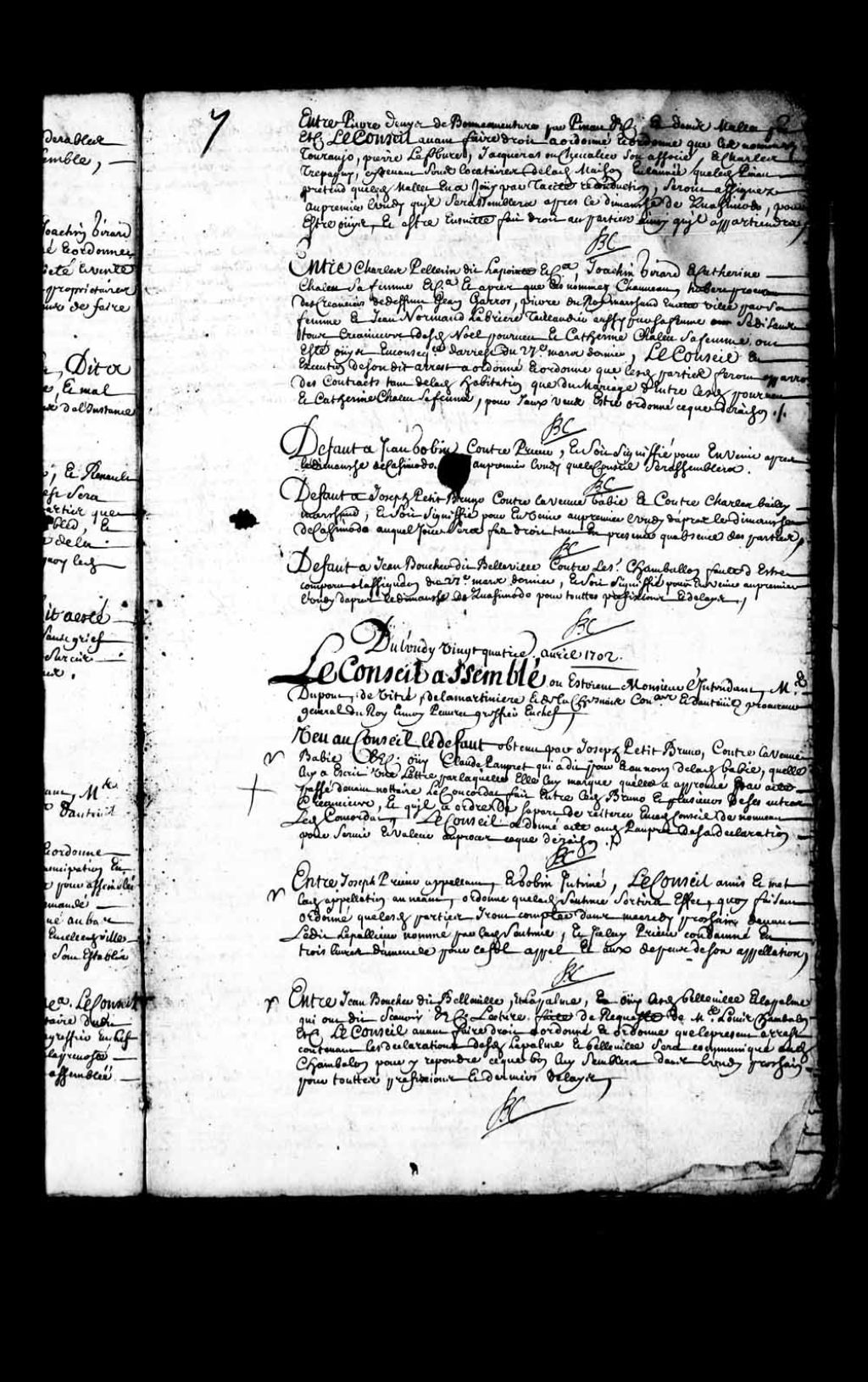 Arrêt ordonnant la communication à Louis Chambalon, notaire de la déclaration de Jean Boucher dit Belleville et Pierre Janson dit Lapalme, 24 avril 1702, Archives nationales à Québec, Fonds Conseil souverain, (03Q,TP1,S28,P7269).