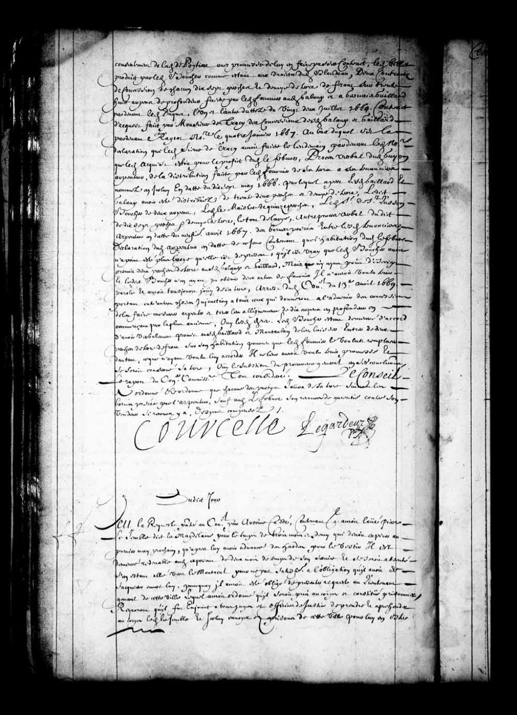 - Transcription du texte avec orthographe modernisée : «Dudit jour. Vu la requête présentée au Conseil par Antoine Caddé, contenant qu'il aurait loué Pierre LeJemble dit LaMadeleine pour le temps de trois mois et demi qui devaient expirer au premier mai prochain qu'après lui avoir avancé des hardes pour le vêtir il est demeuré redevable audit exposant de deux mois de temps de son service et se serait absenté s'en étant allé vers le Montréal pour ne pas satisfaire à l'obligation qu'il avait de s'acquitter envers lui, pourquoi il aurait été obligé de présenter requête au lieutenant général de cette ville, lequel aurait ordonné qu'il serait pris au corps et constitué prisonnier, requérant qu'il fût enjoint à tous juges et officiers de justice de prendre et appréhender au corps ledit LeJemble et icelui envoyé des prisons de cette ville pour lui en être fait telle justice que de raison sur le tort que l'exposant en pouvait recevoir; arrêt du Conseil du cinq décembre 1663; autre arrêt dudit Conseil du quatorze mars 1667. Et un autre arrêt du vingt-trois décembre 1669. marché passé par-devant Duquet notaire le sixième décembre 1670; procès-Verbal de perquisition et recherche faite dudit LeJemble par Gosset huissier les treize, quatorze et quinze du présent mois ; ouï le substitut du procureur général en ses conclusions tout considéré. Le Conseil en confirmation desdits arrêts et exécutant iceux fait défenses à toutes personnes de quelque qualité et condition qu'elles soient de retirer sous quelque prétexte que ce soit Pierre le Jemble ni aucun autre qui pourrait être engagé en quelque sorte de la même manière qu'il le peut-être audit Caddé sans voir congé par écrit de son maître, ou certificat comme il n'aura d'engagement envers quelqu'un pour lui rendre service à peine d'amende arbitraire; enjoint à tous juges et officiers de justice chacun en droit soi de prendre et appréhender au corps ledit LeJemble et icelui envoyé sous sûre garde des prisons de cette ville, comme aussi toutes autres personnes qui peuvent être soupçonnés de fuite, pour être a droit; ordonne qu'à la diligence dudit substitut le présent arrêt sera envoyé en chaque juridiction pour y être publié, affiché et registré à ce que personne n'en ignore et exécuté en tout son contenu, enjoint à lui d'en certifier le Conseil au mois. COURCELLE TALON, LEGARDEUR DE TILLY DAMOURS, TESSERIE DUPONT, DEMOUCHY.»