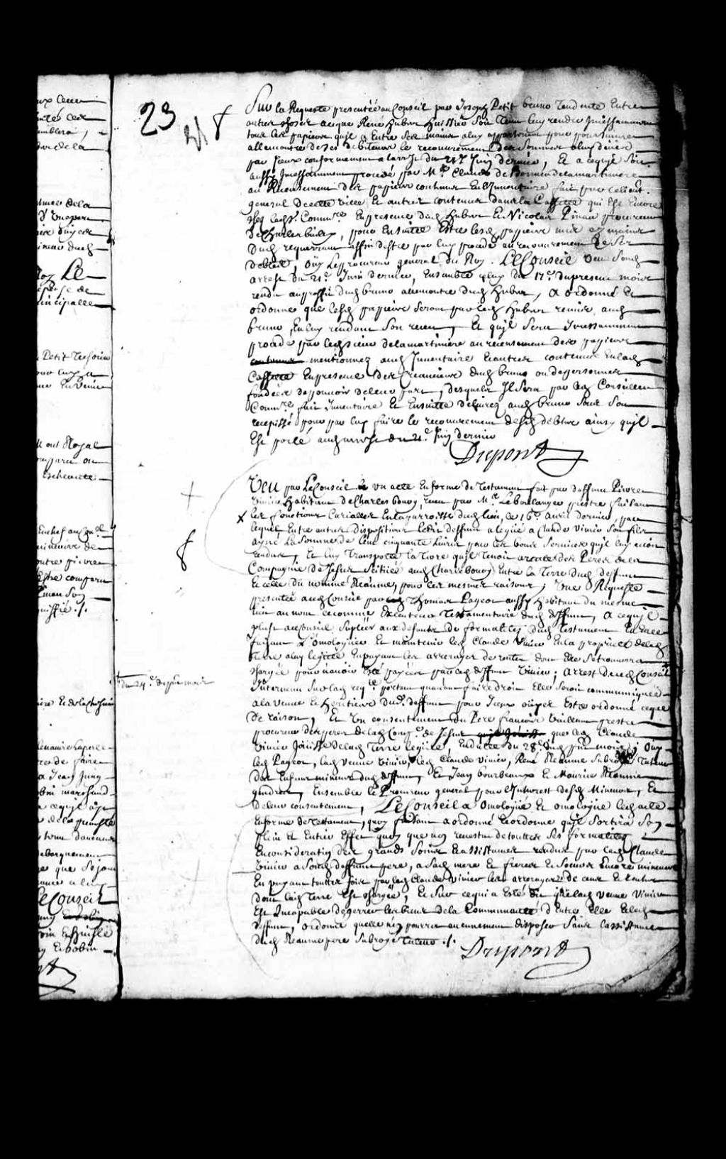 - Vu par le Conseil un acte en forme de testament fait par défunt Pierre Vivier habitant de Charlesbourg reçu par messire Leboulanger prêtre faisant les fonctions curiales en la paroisse dudit lieu, le 16e avril dernier, par lequel entre autres dispositions ledit défunt a légué à Claude Vivier son fils aîné la somme de cent cinquante livres pour les bons services qu'il lui avait rendus, et lui transporte la terre qu'il tenait a rente des pères de la compagnie de Jésus située audit Charlesbourg entre la terre dudit défunt et celle du nommé Réaume, pour les même raisons; une requête présentée audit Conseil par Thomas Pageot (Pageau) aussi habitant du même lieu au nom et comme exécuteur testamentaire dudit défunt, à ce qu'il plût à ce Conseil suppléer aux défauts de formalités dudit testament et en ce faisant l'homologuer et maintenir ledit Claude Vivier en la propriété de ladite terre à lui léguée en payant les arrérages de rentes dont elle se trouvera chargée pour n'avoir été payées par ledit défunt Vivier; arrêt de ce dit Conseil du 24e du présent mois intervenu sur ladite requête portant qu'avant faire droit elle serait communiquée à la veuve et héritiers dudit défunt pour iceux ouïes être ordonné ce que de raison, et un consentement du père François Vaillant prêtre procureur des pères de ladite compagnie de Jésus que ledit Claude Vivier jouisse de ladite terre léguée, en date du 28e dudit présent mois; ouï ledit Pageot, ladite veuve vivier, ledit Claude vivier, René Reaume subrogé tuteur des enfants mineurs dudit défunt, et Jean Bourbeaux et Maurice Reaume gendres, ensemble le procureur général pour l'intérêt desdits mineurs, et de leur consentement, a, le Conseil a homologué et homologue ledit acte en forme de testament, quoi faisant a ordonné et ordonne qu'il sortira son plein et entier effet quoi que non revêtu de toutes ses formalités, en considération des grands soins et assistances rendus par ledit Claude Vivier à sondit défunt père, à sa dite mère et frères et soeurs encore mineurs en payant toutes fois par ledit Claude Vivier les arrérages de cens et rentes dont ladite terre est chargée, et sur ce qui a été dit que ladite veuve Vivier est incapable de gérer les biens de la communauté d'entre elle et ledit défunt, ordonné qu'elle n'en pourra aucunement disposer sans l'assistance dudit Reaume père subrogé tuteur. DUPONT