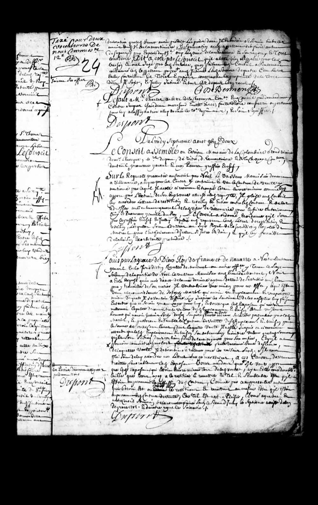 Transcription du texte avec orthographe modernisée : «Louis par la grâce de Dieu Roi de France et de Navarre à notre lieutenant général en la juridiction royale de Montréal ou autre officier y tenant le siège Salut, de la partie de Noël Levasseur menuisier audit lieu de Montréal, nous a été exposé qu'au mois d'août de l'année dernière ayant dessein de s'établir audit lieu pour y travailler de son métier il voulut louer une maison pour cet effet, ce qui étant venu à la connaissance de Joseph Martel qui avait un emplacement et une petite maison desquels il se voulait défaire, lui inspira les sentiments de les acheter lui faisant entendre que ce serait un avantage pour lui, en sorte que ledit exposant qui n'était nullement capable de connaître la valeur desdits emplacement et maison étant un jeune homme qui n'avait jamais sorti de chez son père, étant même encore mineur se laissa persuader par ledit Martel, et passèrent ensemble le contrat de vente desdits emplacement et maison pour la somme de onze cents livres, dans laquelle vente il a été surpris et circonvenu attendu que lesdits emplacement et maison sont de beaucoup moindre valeur que ladite somme, qu'ils sont situés dans un lieu fort désavantageux pour son métier, ce qu'il ne pouvait connaître pour lors faute de connaissance des lieux, de laquelle vente il désirerait se relever pour les raisons susdits s'il nous plaisait de lui accorder nos lettres sur ce nécessaires, à ces causes, désirant traiter favorablement ledit exposant Vous mandons que les parties dûment assignées par-devant vous s'il vous appert que ledit exposant, qui était encore mineur lors de ladite vente, ait été considérablement laissé que vous ayez a le restituer et remettre en tel et semblable état qu'il était auparavant la passation dudit contrat, comme par ces présentes autant que besoin est ou serait le restituons et remettons au même état qu'il était auparavant ledit contrat de vente, car tel est notre plaisir, donné à Québec en notre Conseil souverain de la Nouvelle-France sous le sceau d'icelui le septième août de l'an de grâce 1702 et de notre règne le soixantième. DUPONT.»