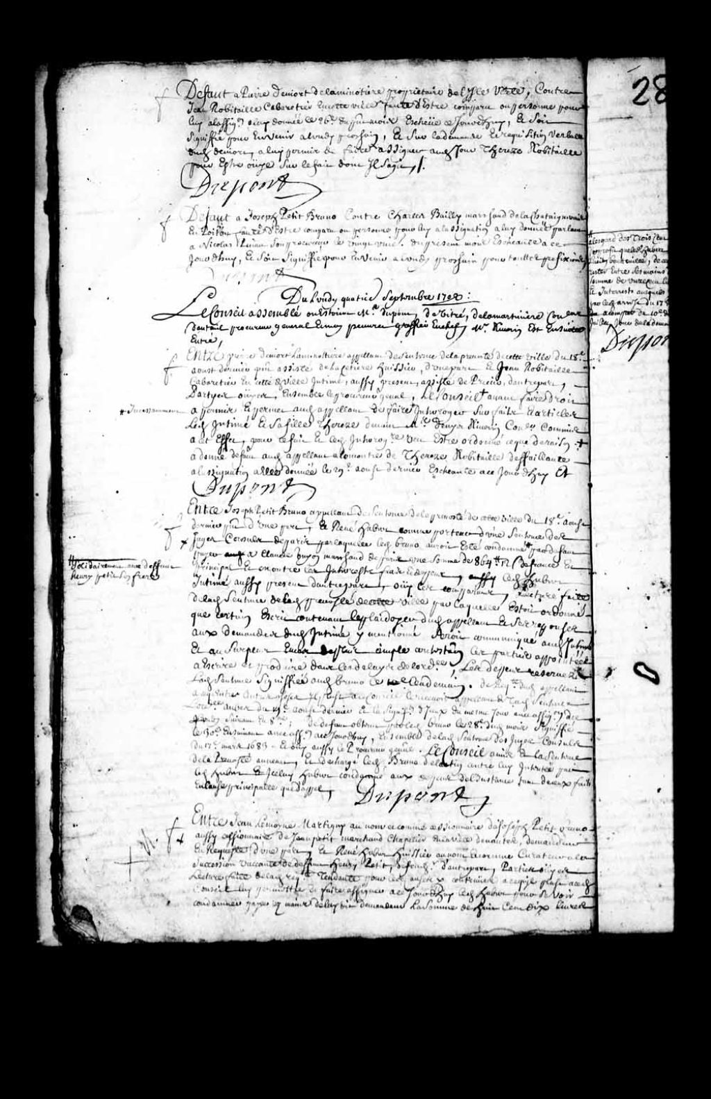 Transcription du texte avec orthographe modernisée : «Défaut à Pierre Deniort (De Niort) de La Minotière propriétaire de l'île verte, contre Jean Robitaille cabaretier en cette ville faute d'être comparu ou personne pour lui a l'assignation à lui donnée le 26e du présent mois échue ce jourd'hui, et soit signifié pour en venir à lundi prochain, et sur la demande et réquisition verbale dudit Deniort, à lui permis de faire assigner audit jour Thérèse Robitaille pour être ouïe sur le fait dont il s'agit. DUPONT.»
