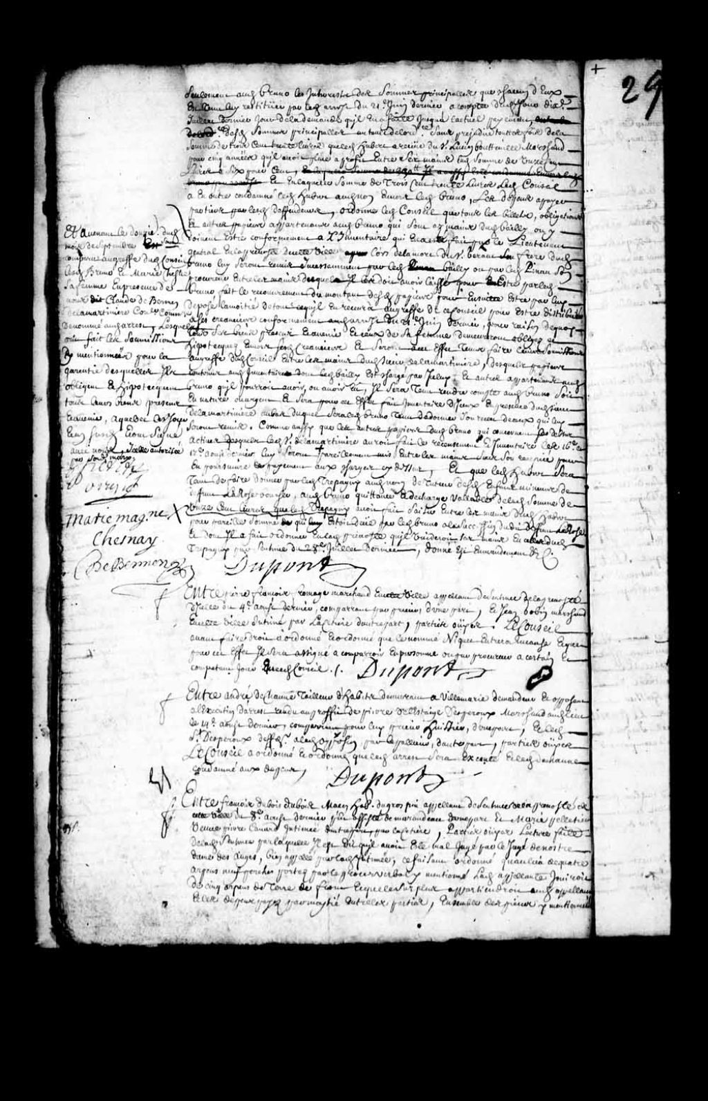Transcription du texte avec orthographe modernisée : «Entre Pierre François FROMAGE marchand en cette ville appelant de sentence de la prévôté d'icelle du 4e août dernier, comparant par Prieur, d'une part, et Jean GOBIN marchand en cette ville intimé par LaCetière d'autre part. Parties ouïes, le Conseil avant faire droit a ordonné et ordonne que le nommé Niquet entrera en cause et que pour cet effet il sera assigné à comparoir en personne ou par procureur à certain et compétent jour en ce dit Conseil. DUPONT.»
