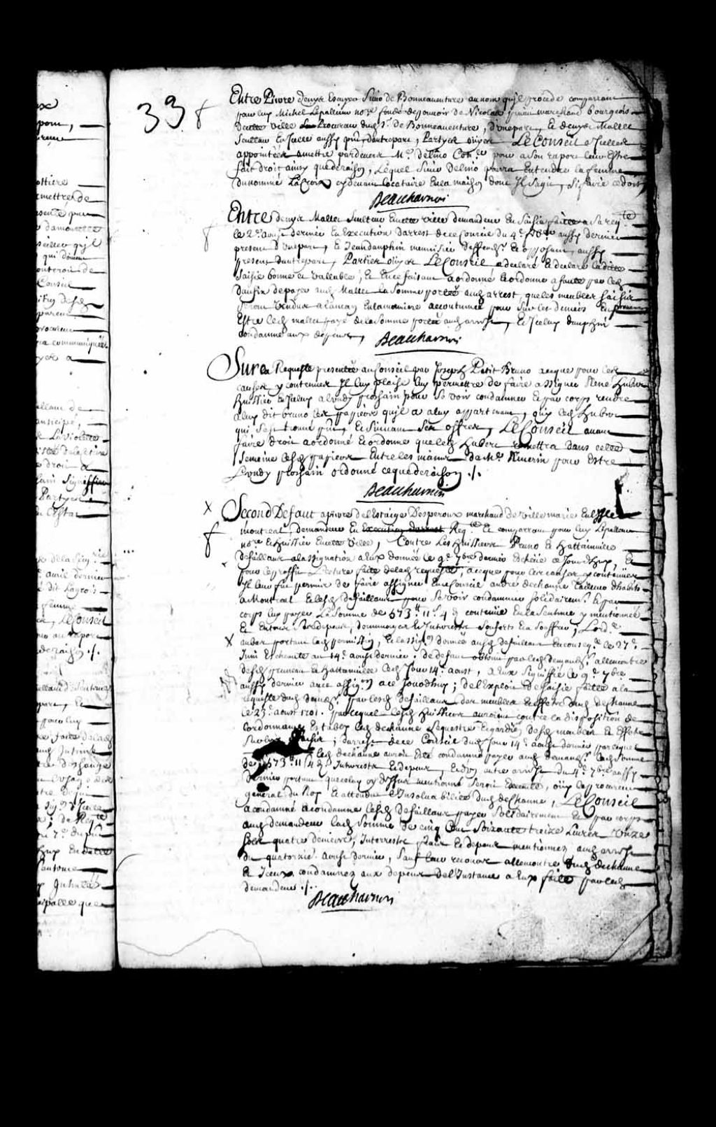Transcription du texte avec orthographe modernisée : «Entre Pierre Denis écuyer sieur de Bonaventure au nom qu'il procède comparant pour lui Michel Lepallieur (Lepailleur) notaire fondé de pouvoir de Nicolas Pinau (Pinault, Pineau) marchand bourgeois de cette ville procureur dudit Saint-de Bonaventure, d'une part, et Denis MALLET sculpteur en icelle aussi présent, d'autre part. Parties ouïes, le Conseil à icelles appointées à mettre par devers maître Delino (De Lino) conseiller pour à son rapport leur être fait droit ainsi que de raison, lequel sieur Delino (De Lino) pourra entendre la femme du nommé LaCroix ci-devant locataire en la maison dont il s'agit, si faire ce doit. BEAUHARNOIS.»