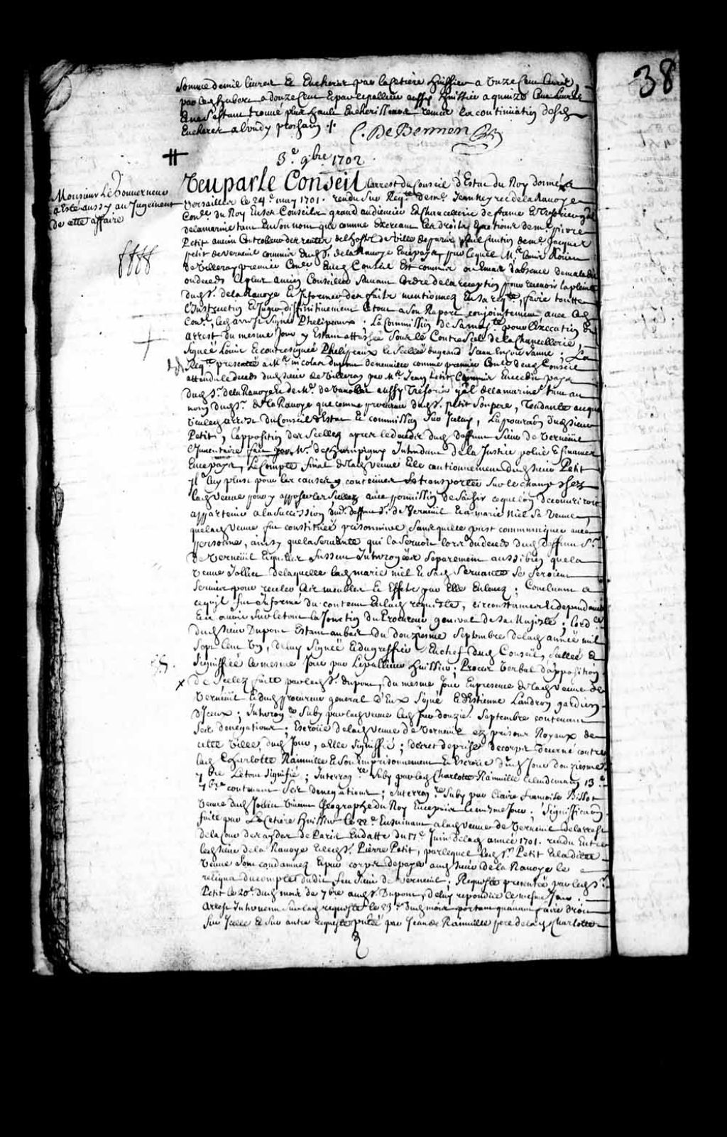- Transcription du texte avec orthographe modernisée : «3e novembre 1702. Monsieur le gouverneur a été aussi au jugement de cette affaire. Vu par le Conseil l'arrêt du Conseil d'état du Roi donné à Versailles le 24e mai 1701 rendu sur requête de maître Jean Meyret (Meiret) de la Ravoye conseiller du Roi en ses Conseils grand audiencier en chancellerie de France et trésorier général de la marine tant en son nom que comme exerçant les droits et actions de maître Pierre Petit ancien contrôleur des rentes de l'hôtel de ville de Paris seul caution de maître Jacques Petit de Verneuil commis dudit sieur de La Ronaye en ce pays, par lequel maître Louis Rouer de Villeray premier conseiller en ce dit Conseil est commis ou en cas d'absence de maladie ou décès le plus ancien conseiller suivant l'ordre de la réception pour recevoir la plainte dudit sieur de La Ravoye et informer des faits mentionnés en sa requête, faire toute l'instruction et juger définitivement le tout à son rapport conjointement avec ledit conseiller, ledit arrêt signé Phelipaux; la commission de sa Majesté pour l'exécution dudit arrêt du même jour y étant attachée sous le contre-sceau de la chancellerie, signée Louis et contresignée Phelipaux et scellée du grand sceau en cire jaune; la requête présentée à maître Nicolas Dupont de Neuville comme premier conseiller de ce dit Conseil attendu le décès dudit sieur de Villeray par maître Jean Petit commis en ce dit pays dudit sieur de La Ravoye et de maître de Vanolles aussi trésorier général de la marine tant au nom dudit sieur de La Ravoye que comme procureur dudit sieur Petit son père, tendante à ce que vu ledit arrêt du Conseil d'état et commission sur icelui, la procuration dudit sieur Petit, l'apposition des scellés après le décès dudit défunt sieur de Verneuil l'inventaire fait par Monsieur de Champigny intendant de la justice police et finances en ce pays, le compte final de ladite veuve et le cautionnement dudit sieur Petit il lui plut pour les causes y contenues se transporter sur le champ chez ladite veuve pour y apposer les scellés avec permission de saisir ce que l'on découvrirait appartenir à la succession dudit défunt sieur de Verneuil et à Marie Niel sa veuve, que ladite veuve fut constituée prisonnière sans qu'elle pût communiquer avec personne, ainsi que la servante qui la servait lors du décès dudit défunt sieur de Verneuil et qu'elles fussent interrogées séparément aussi bien que la veuve Jolliet de laquelle ladite Marie Niel et sa dite servante se seraient servies pour receler les meubles et effets par elle enlevés; concluant à ce qu'il fût informé du contenu en ladite requête, circonstances et dépendances et à avoir sur le tout la jonction du procureur général de sa Majesté; l'ordonnance dudit sieur Dupont étant au bas du douzième septembre de ladite année mille sept cent un, de lui signée et du greffier en chef dudit Conseil, scellée et signifiée les même jour par Lepaillieur huissier; procès-verbal d'opposition de scellés faite par ledit sieur Dupont, du même jour en présence de ladite veuve de Verneuil et dudit procureur général d'eux signé et de Etienne Landron gardien d'iceux; interrogatoire subi par ladite veuve ledit jour douzième septembre contenant ses dénégations; écrou de ladite veuve de Verneuil des prisons royaux de cette ville, dudit jour, à elle signifié; décret de prise de corps décerné contre ladite Charlotte Rainville et son emprisonnement et écrou dudit jour douzième septembre le tout signifié; interrogatoire subi par ladite Charlotte Rainville le lendemain 13e septembre contenant ses dénégations; interrogatoire subi par Claire Françoise Bissot veuve dudit Jolliet vivant géographe du Roi en ce pays le même jour; signification faite par LaCetière huissier le 22e ensuivant à ladite veuve de Verneuil de l'arrêt de la Cour des aides de Paris en date du 17e juin de ladite année 1701 rendu entre ledit sieur de La Ravoye et ledit sieur Pierre Petit, par lequel ledit sieur Petit et ladite veuve sont condamnés et par corps de payer audit sieur de La Ravoye le reliquat du compte dudit feu sieur de Verneuil; requête présentée par ledit sieur Petit le 20e dudit mois de septembre audit sieur Dupont, de lui répondue le même jour. Arrêt intervenu sur ladite requête le 23e dudit mois portant qu'avant faire droit sur icelle et sur autre requête présentée par Jean de Rainville père de ladite Charlotte Rainville qu'elles seraient entre autres choses communiquées audit procureur général, copie de requête présentée par ledit sieur Petit fils au nom qu'il procède à mondit sieur de Champigny pour le prier de s'abstenir de connaître de l'affaire en question; autre requête présentée en ce dit Conseil par ledit sieur Petit au sujet de ladite récusation; arrêt intervenu sur icelles le 24e du même mois par lequel les moyens de ladite récusation auraient été déclarés inadmissibles et ordonne que mondit sieur l'intendant demeurerait juge; autre requête dudit sieur Petit adressée audit sieur Dupont pour avoir permission de faire approcher témoins aux fins de ladite information et l'ordonnance en conformité dudit jour 24e septembre et le rapport des assignations données par ledit LaCetière aux témoins le même jour; autre requête présentée par ledit sieur Petit audit sieur Dupont par laquelle il lui expose une déclaration qui lui avait été faite par ladite veuve et qu'elle avait signée, demandant qu'il lui plût se transporter en ladite prison pour l'interroger sur icelle et sur les autres mémoires qui lui pourraient être fournis, ou autres qu'il jugerait à propos d'office, au bas de laquelle est l'ordonnance dudit sieur Dupont portant qu'il se transporterait en la chambre de ce dit Conseil aux fins de ladite requête; procès-verbal de ladite répétition faite par ledit sieur Dupont de ladite veuve de Verneuil e