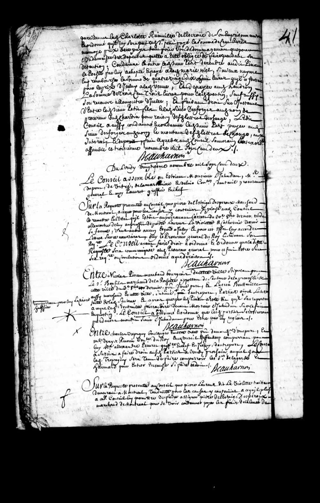 Transcription du texte avec orthographe modernisée : «Entre Nicolas Pinau (Pineau, Pinault) marchand bourgeois de cette ville stipulant pour les Bonfils marchands de La Rochelle appelant de sentence de la prévôté de cette ville du 3e octobre dernier, présent d'une part, et Lucien Boutteville (Bouteville) aussi marchand en cette ville, intimé comparant pour lui LaCetière huissier d'autre part. Parties ouïes, lecture faite de ladite sentence et après que par ledit Pinau (Pineau, Pinault) a été dit qu'il s'en rapportera à ce que ledit Boutteville (Bouteville) pourra dire devant Monsieur l'intendant sur le fait en question. Le Conseil a ordonné et ordonne que lesdites parties se retireront par devers mondit sieur l'intendant pour être par lui réglées. BEAUHARNOIS.»