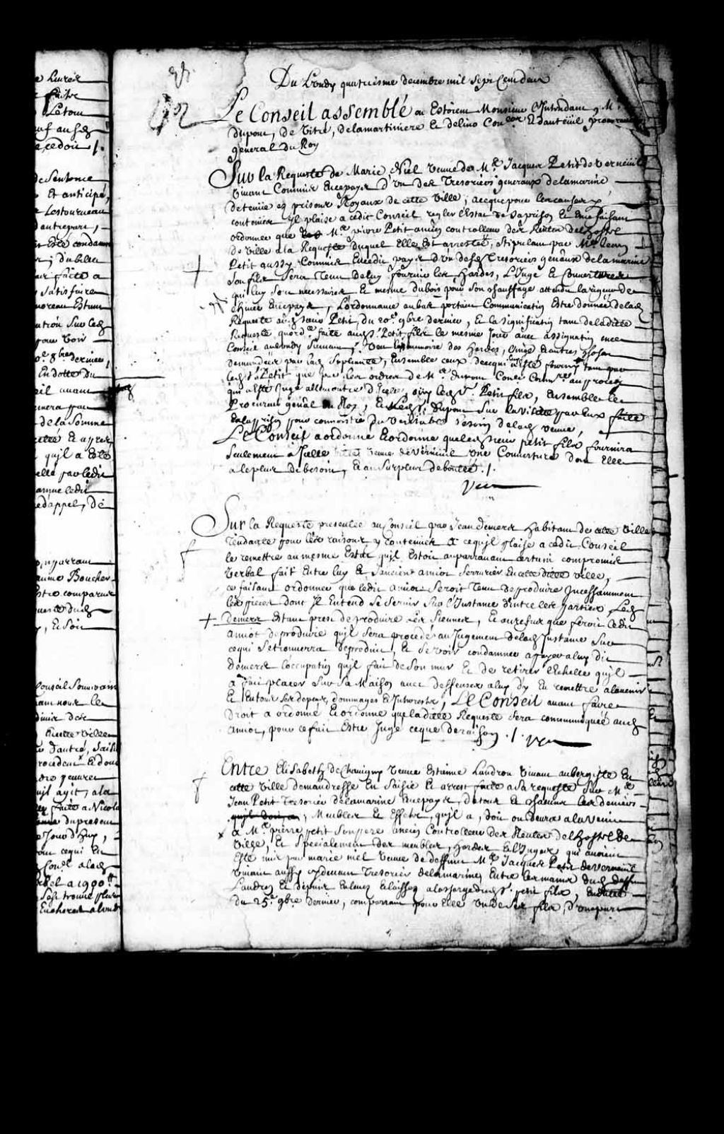 Arrêt ordonnant de communiquer à Gentien (Jean) Amiot, serrurier, la requête de Jean Demers, habitant de Québec demandant à être remis en l'état qu'il était auparavant un certain compromis verbal fait entre lui et le dit Amiot, 4 décembre 1702, Archives nationales à Québec, Fonds Conseil souverain, (03Q,TP1,S28,P7447).